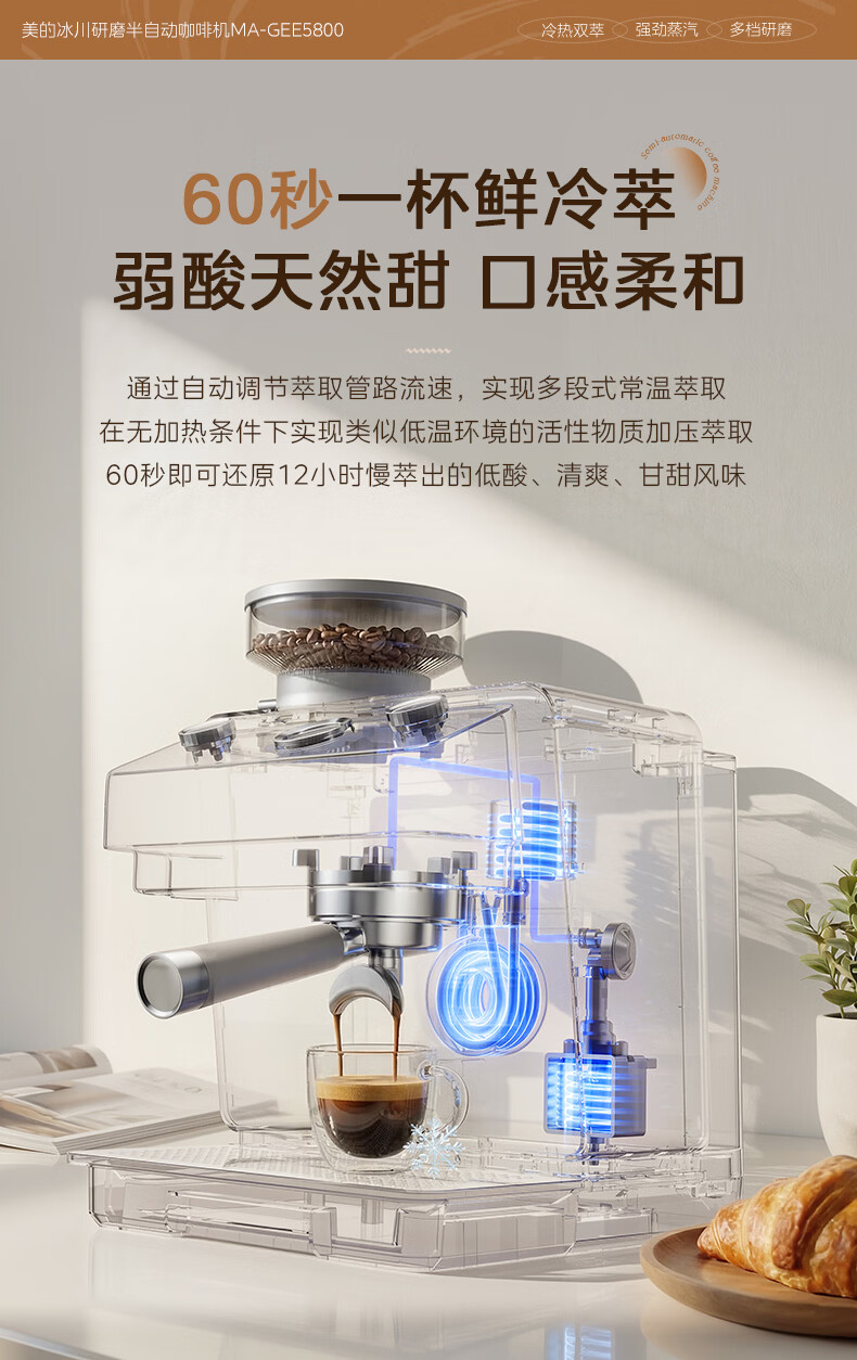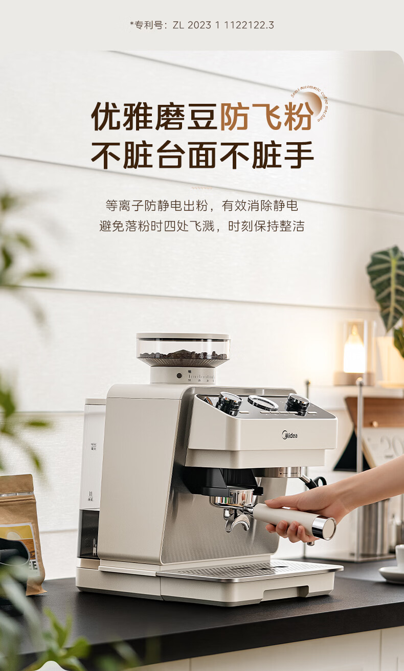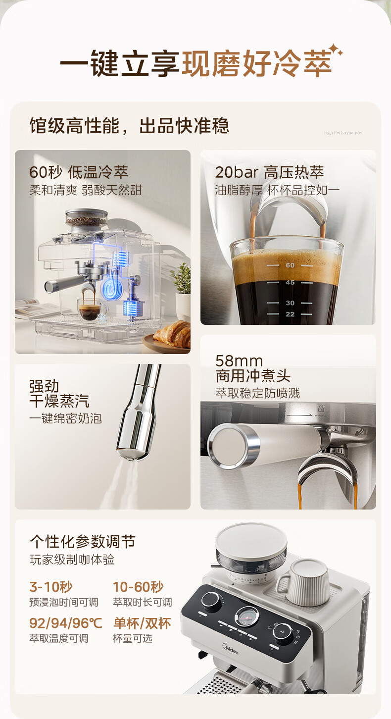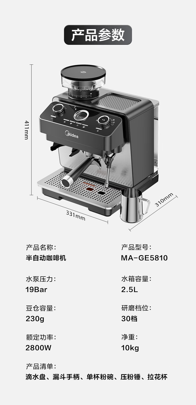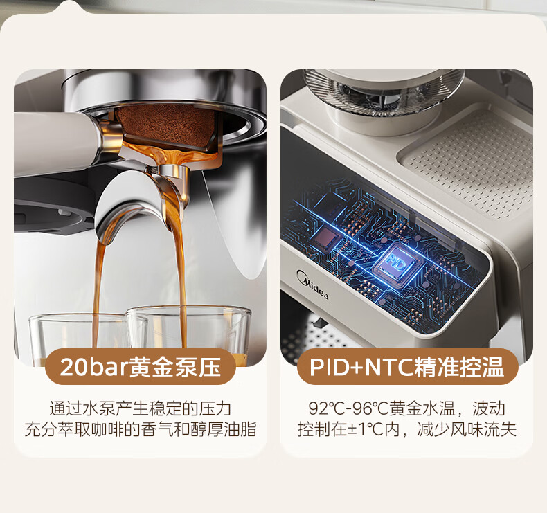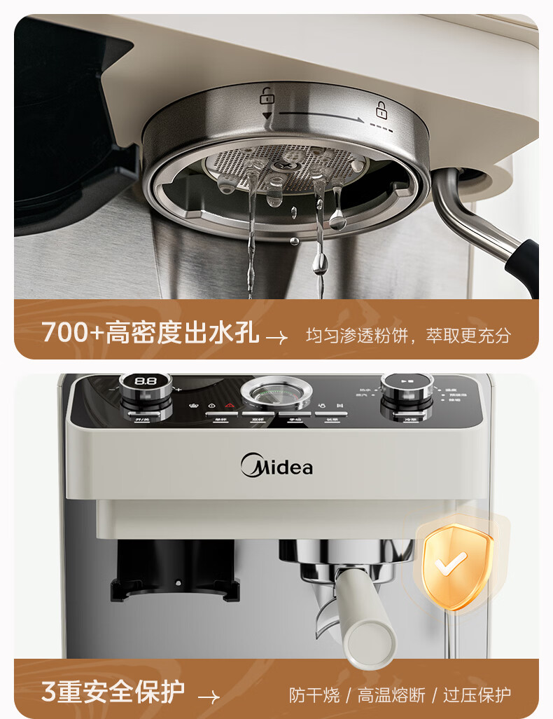美的(Midea)半自动咖啡机磨豆机冷萃研磨一体机家用意式浓缩双锅炉可视压力30档研磨 【玄武】MA-GE5810黑武士