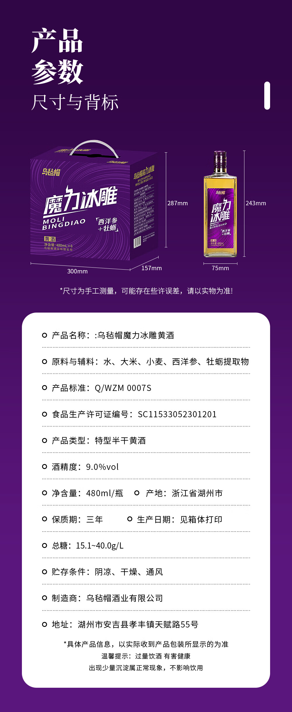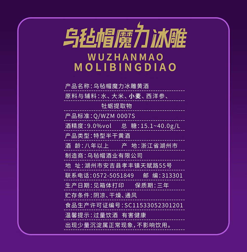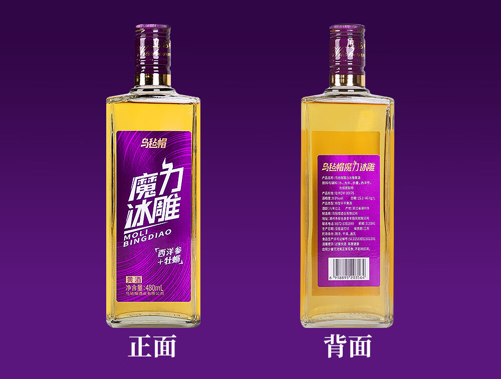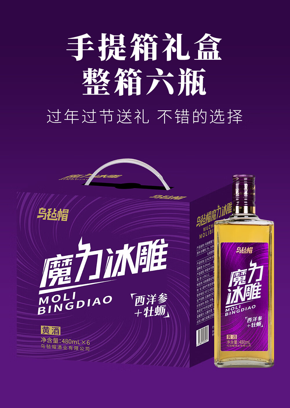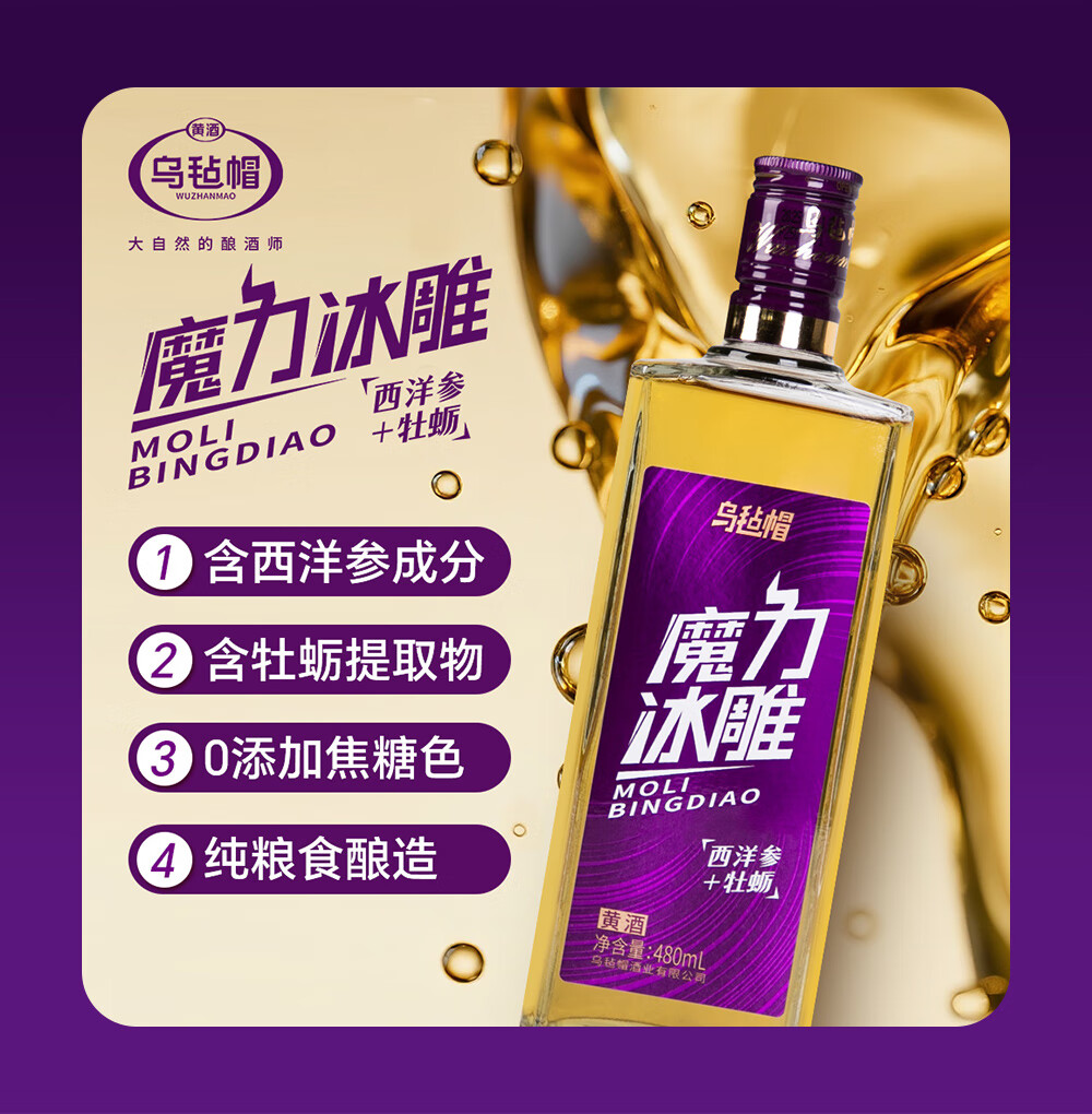 乌毡帽魔力冰雕绍兴工艺西洋参牡蛎提取物无焦糖色黄酒480ml*6瓶 乌毡帽魔力冰雕黄酒 480mL 6瓶 整箱装