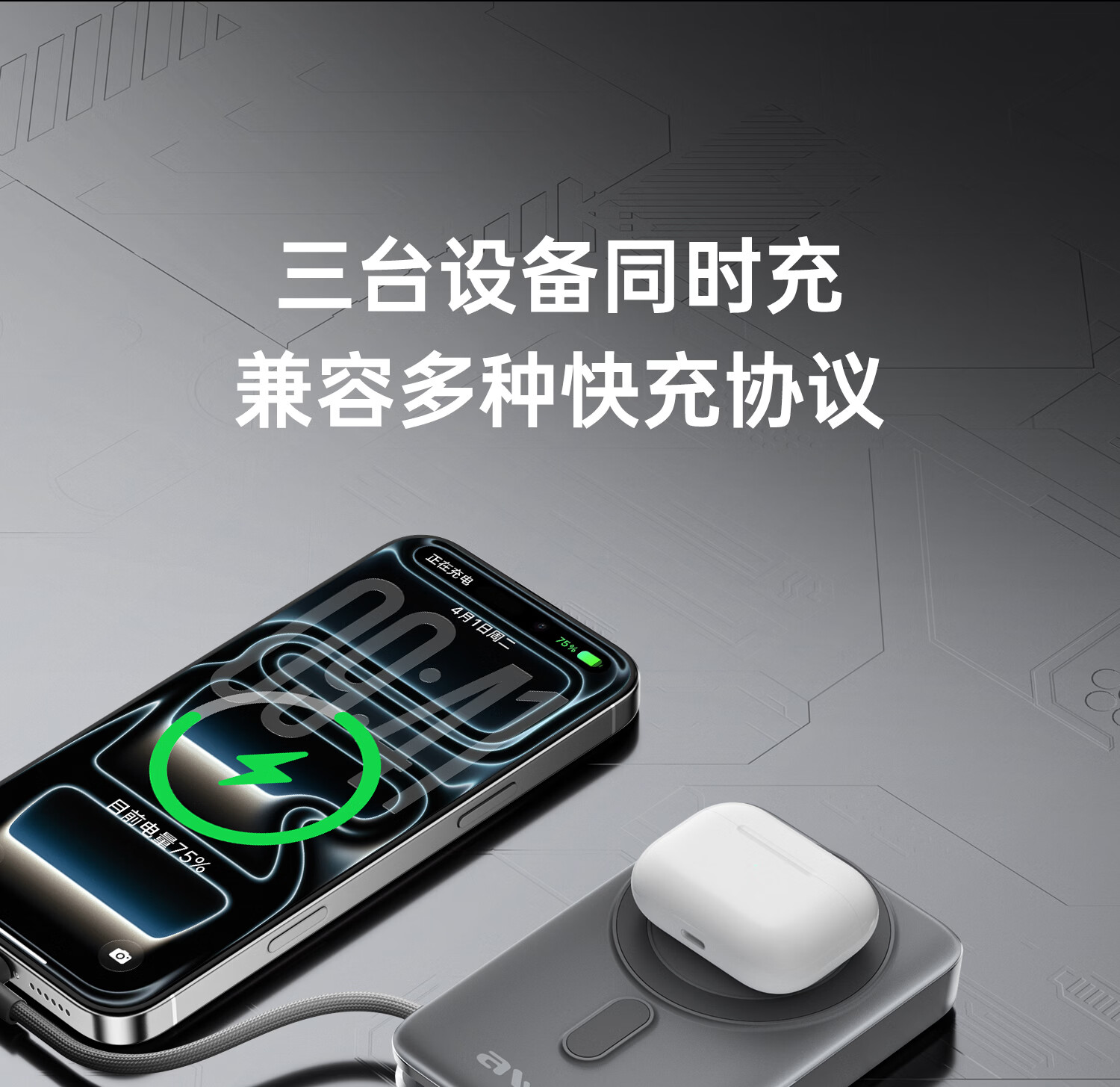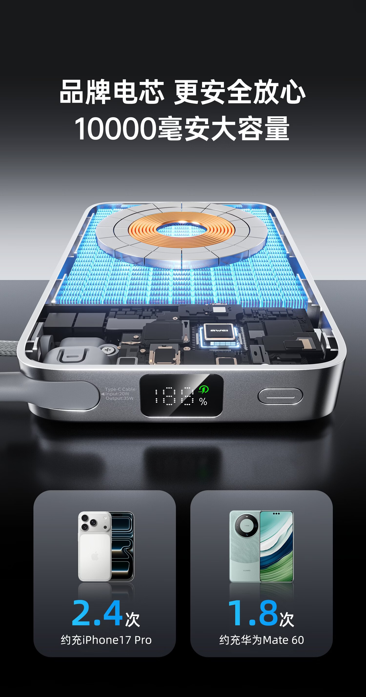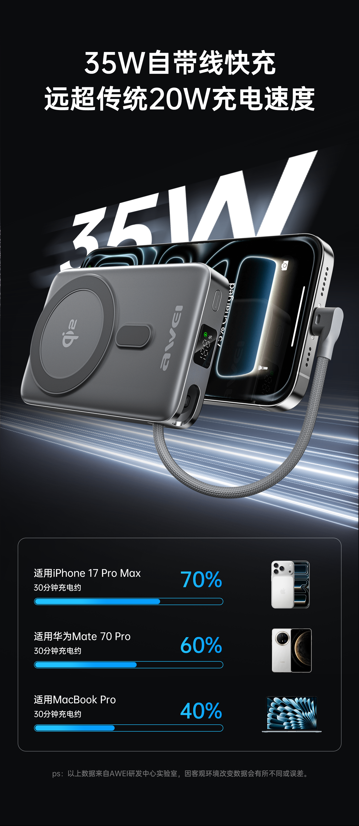 用维(AWEI)充电宝35W快充自带线三合一Qi2磁吸magsafe支架超薄式移动电源适用苹果【国家3C认证可上飞机】 【石墨黑】Qi2磁吸丨35W快充丨自带支架 10000mAh