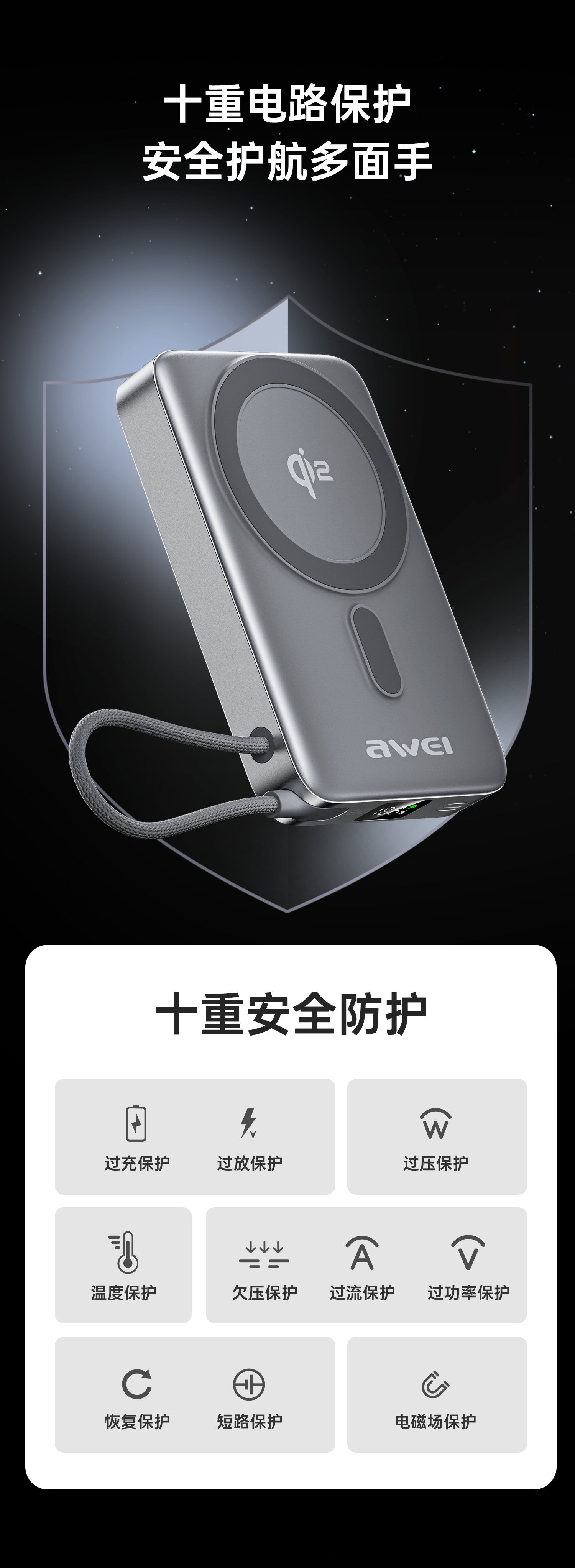 用维(AWEI)充电宝10000毫安大容量自带线小巧便携22.5W超级快充移动电源适用苹果【国家3C认证可上飞机】 魔幻黑丨带线款丨一线搞定苹果/安卓/自充 10000mAh
