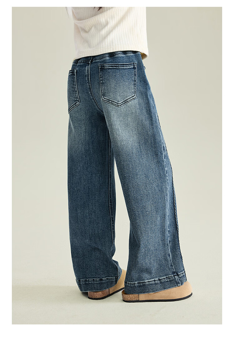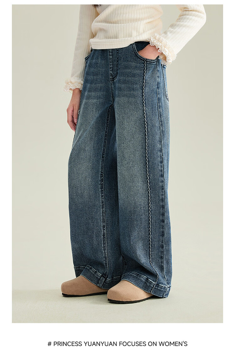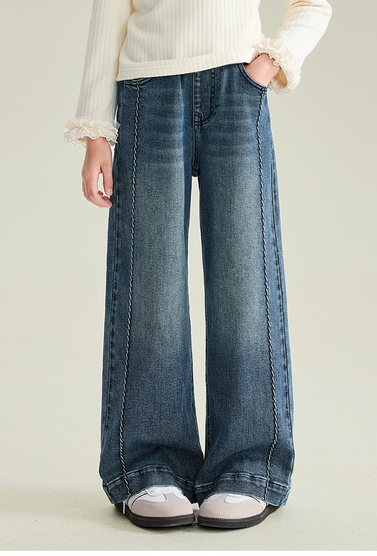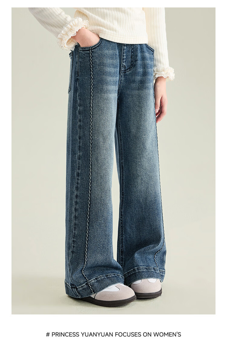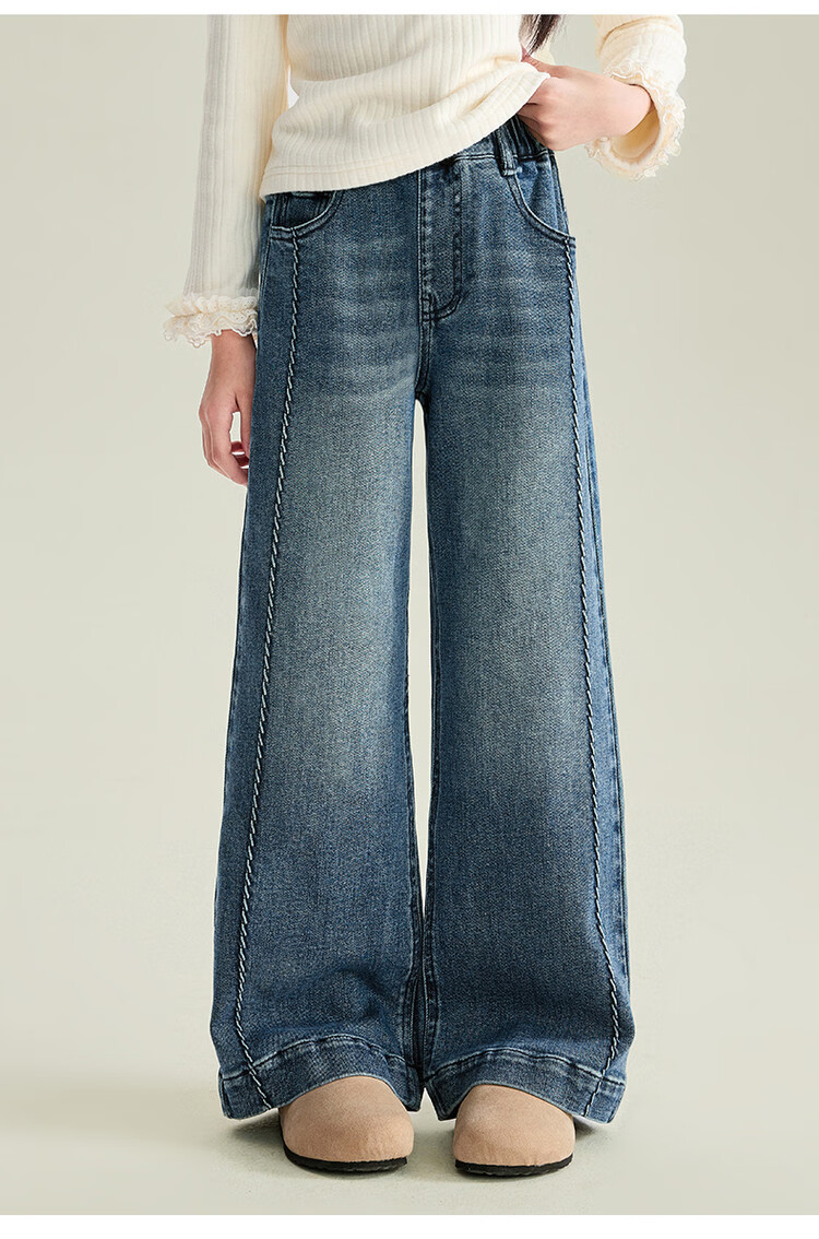 媛媛公主【经典百搭高棉牛仔裤】儿童长裤秋冬款女童加绒柔软阔腿裤直筒裤 牛仔蓝(加绒加厚款) 110