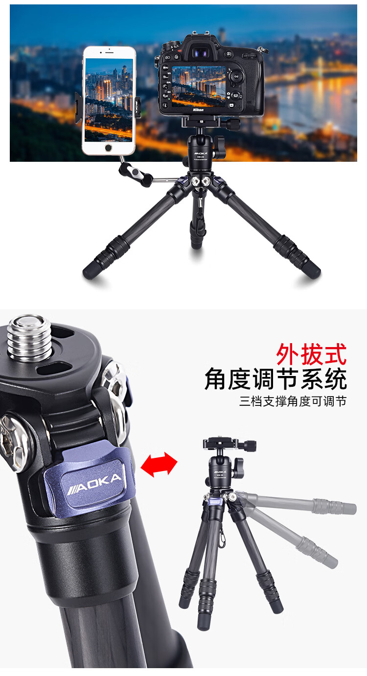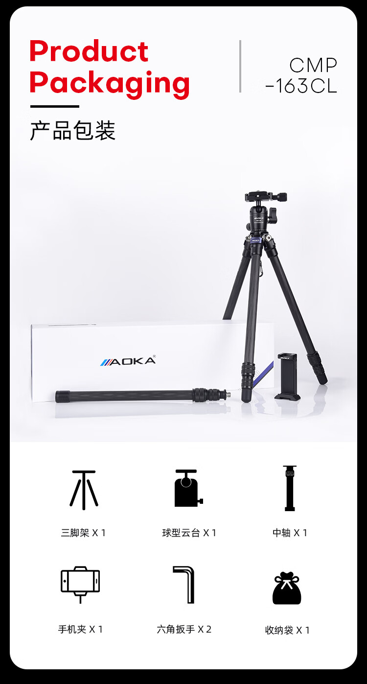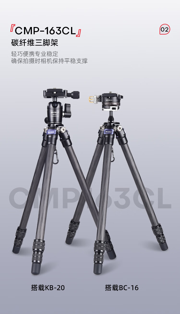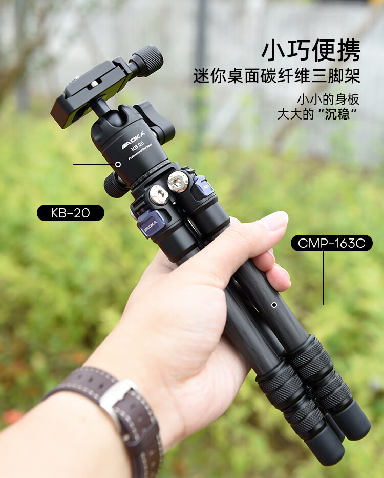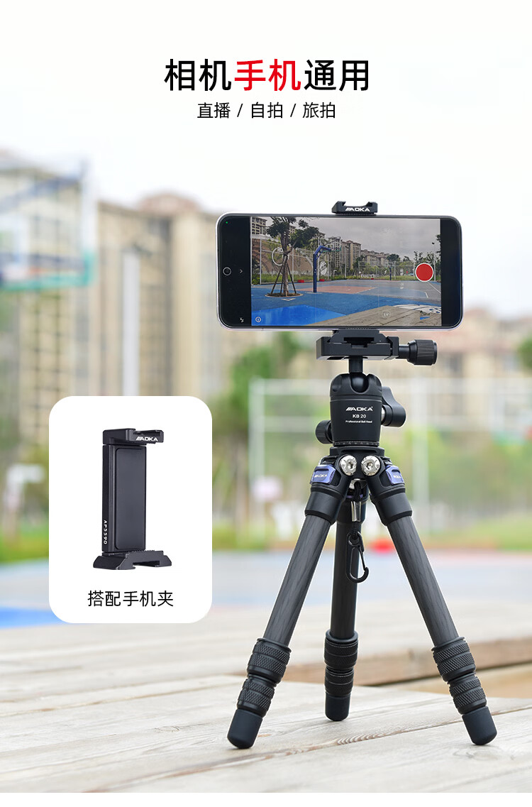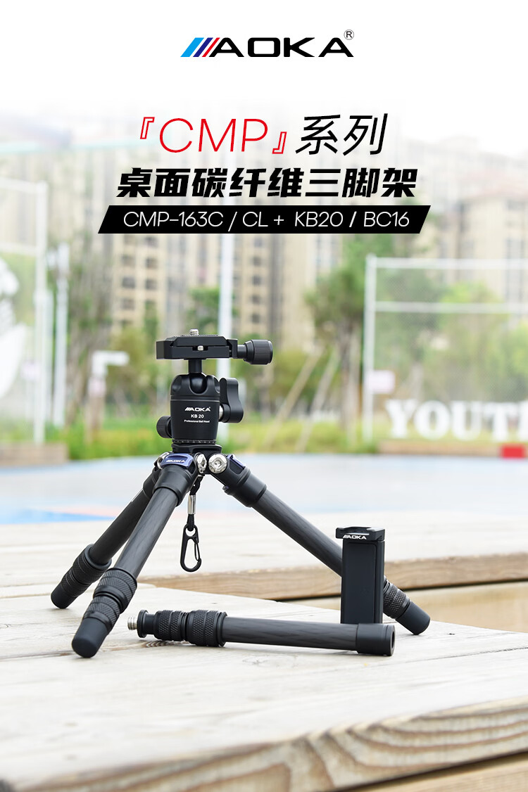 AOKA奥咔CMP163系列轻巧便携碳纤维三脚架手持单反微单摄影三角架手机旅行自拍直播拍摄vlog短视频 CMP163CL 脚架 + KB-20 + 中轴 + 手机夹