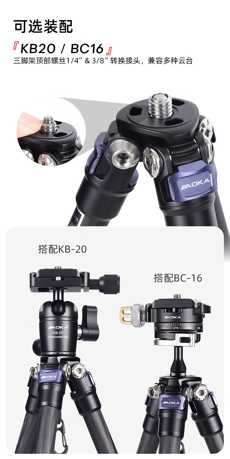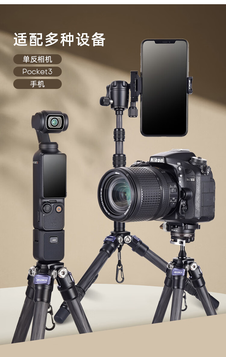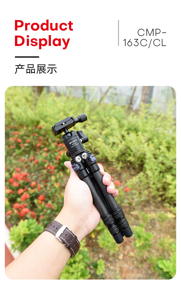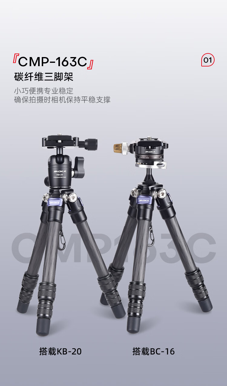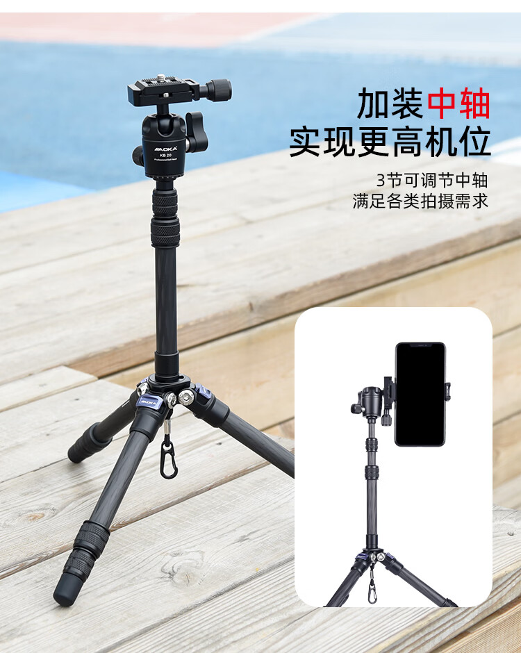 AOKA奥咔CMP163系列轻巧便携碳纤维三脚架手持单反微单摄影三角架手机旅行自拍直播拍摄vlog短视频 CMP163CL 脚架 + KB-20 + 中轴 + 手机夹