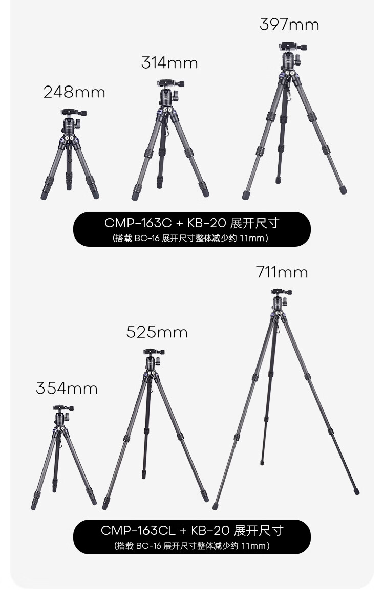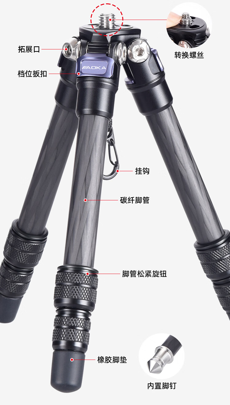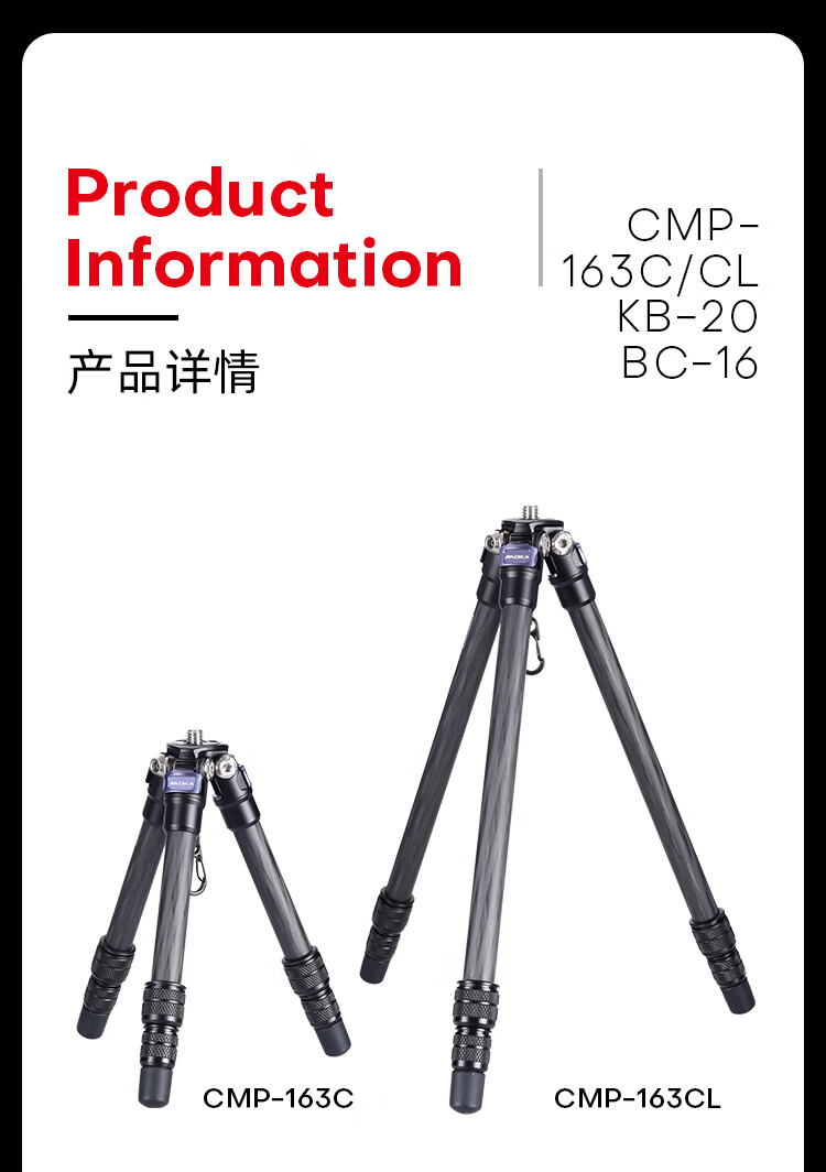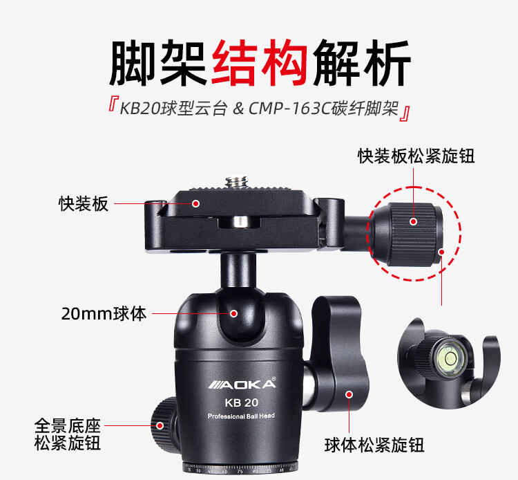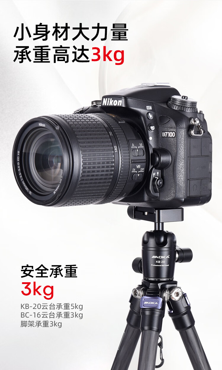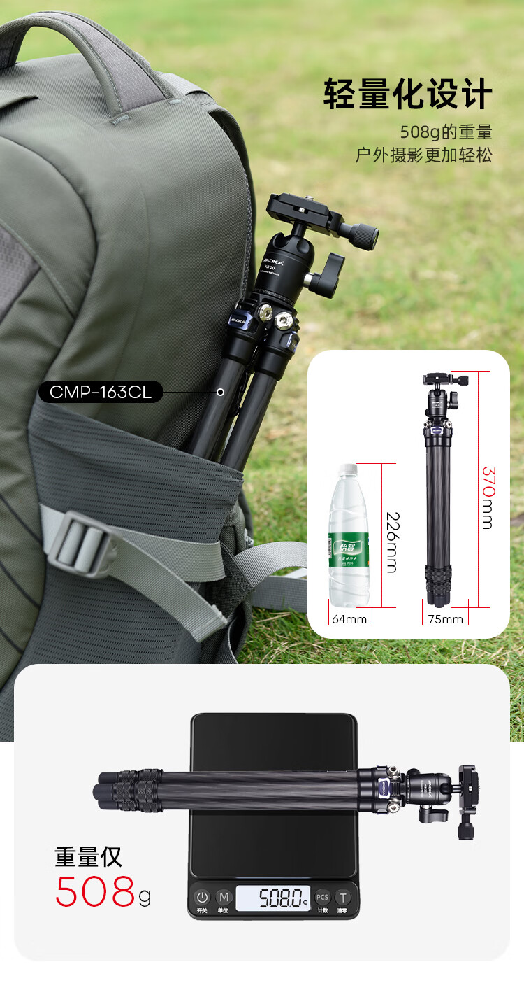 AOKA奥咔CMP163系列轻巧便携碳纤维三脚架手持单反微单摄影三角架手机旅行自拍直播拍摄vlog短视频 CMP163CL 脚架 + KB-20 + 中轴 + 手机夹