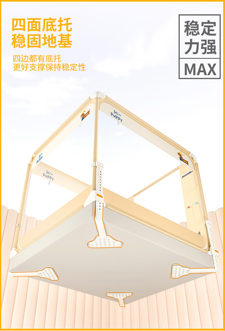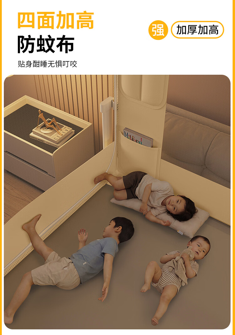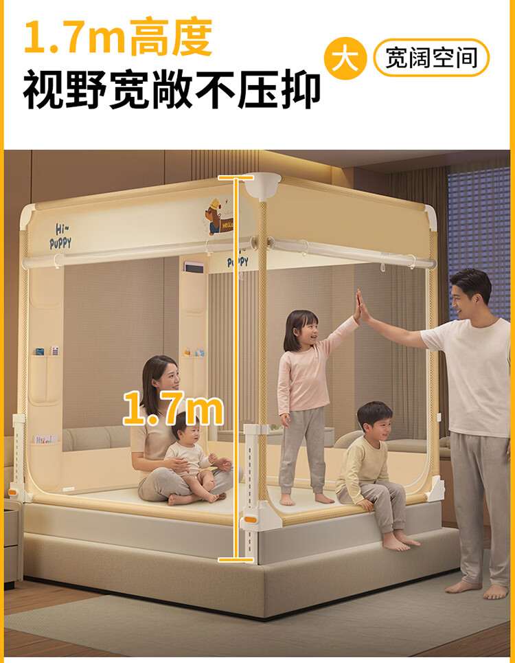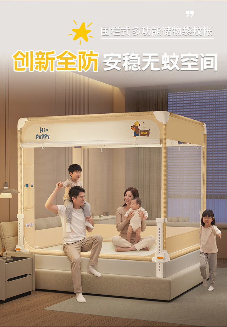 无印良品婴儿防摔蚊帐1.5米x2米家用一体式免安装全包围防掉床围栏蚊帐架 奶灰小熊【A类品质 泰山级围栏支架 稳固防摔】 150cm*200cm*170cm 擎天柱大脚板支架【真护栏级防摔】