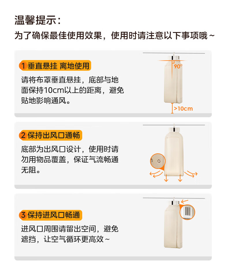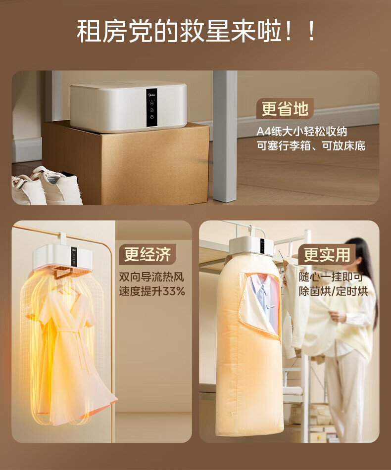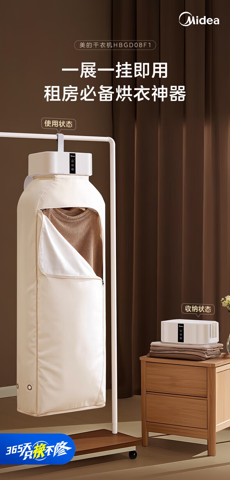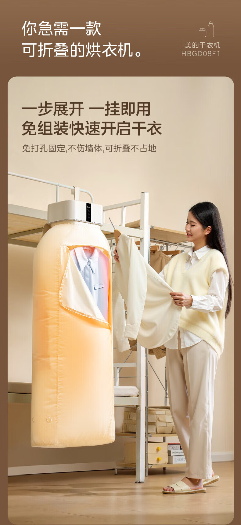 美的(Midea)烘干机家用烘衣服小型旅行短期打工租房易携带干衣机可折叠便携式宿舍烘衣机08F1烘干除湿除菌除螨 米白色 135L 悬挂款+易组装