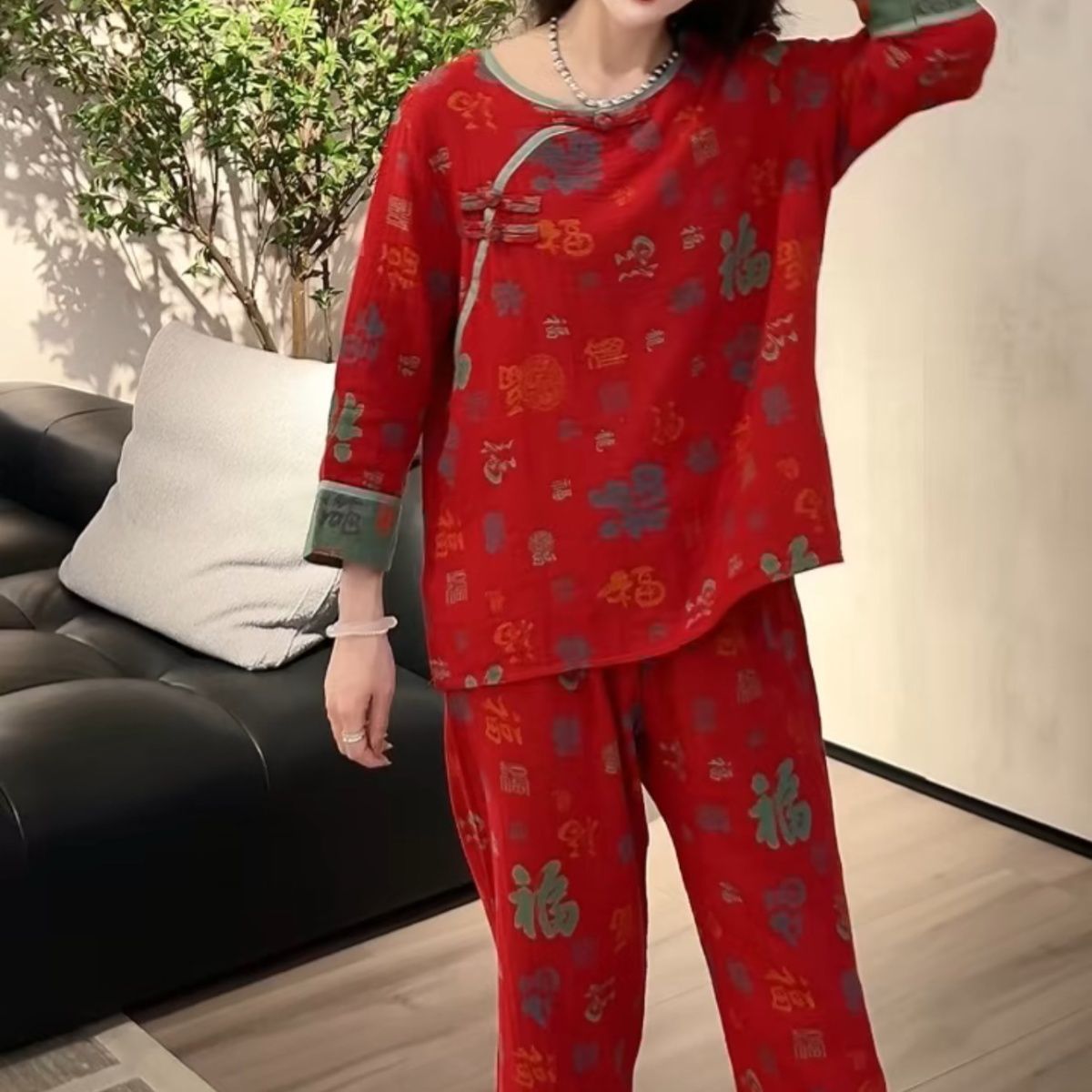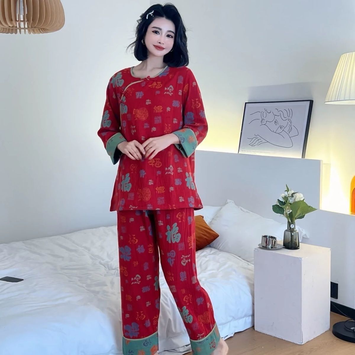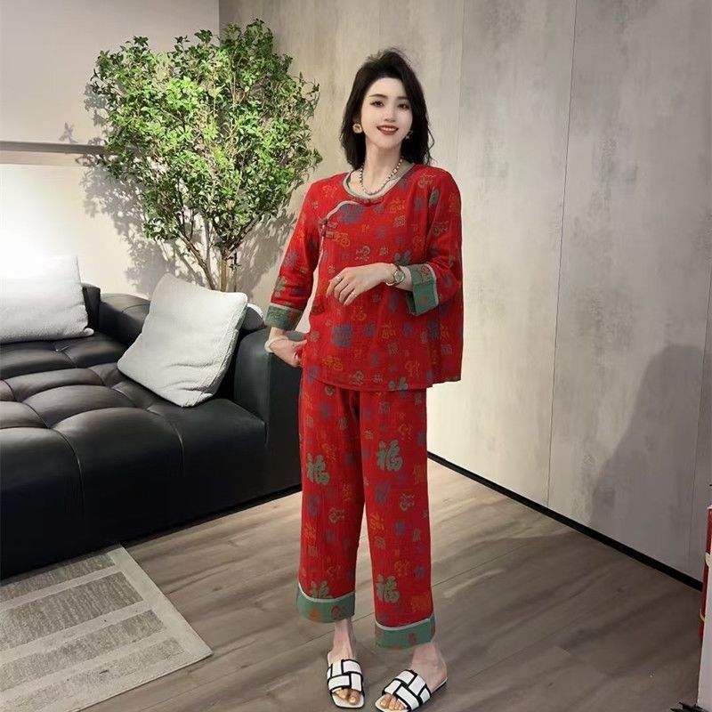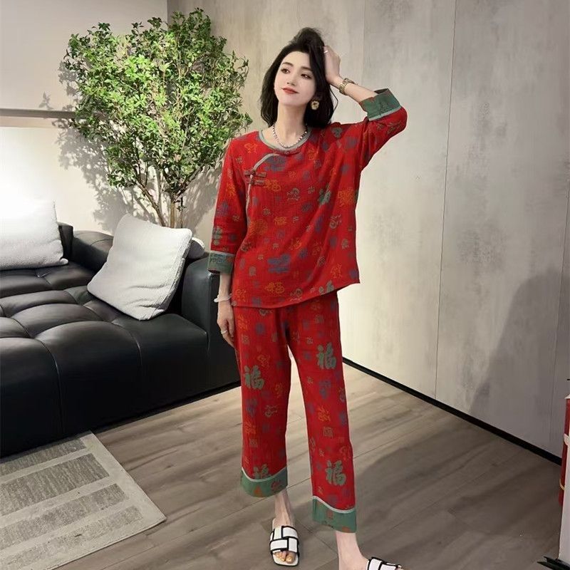 中式新款长袖长裤睡衣女本命年复古国风宽松休闲时尚家居服套装