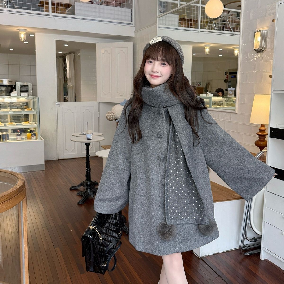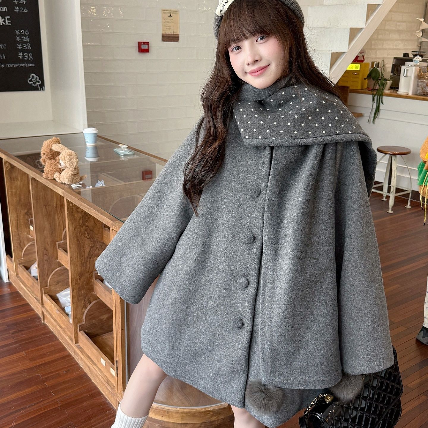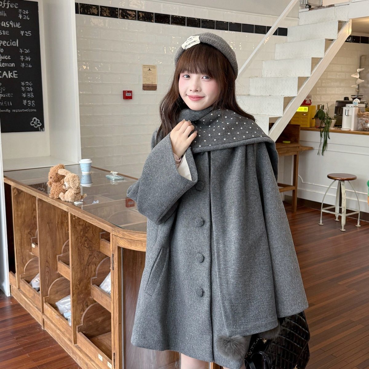 甜美风灰色斗篷披肩毛呢外套女气质百搭加厚宽松韩系自带围脖大衣