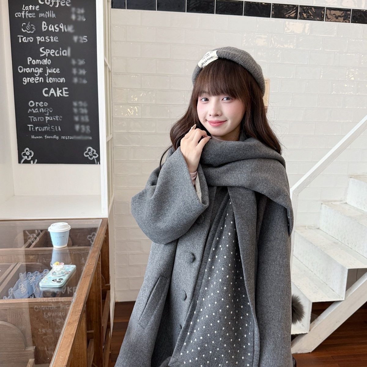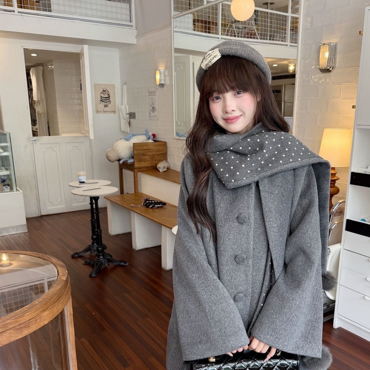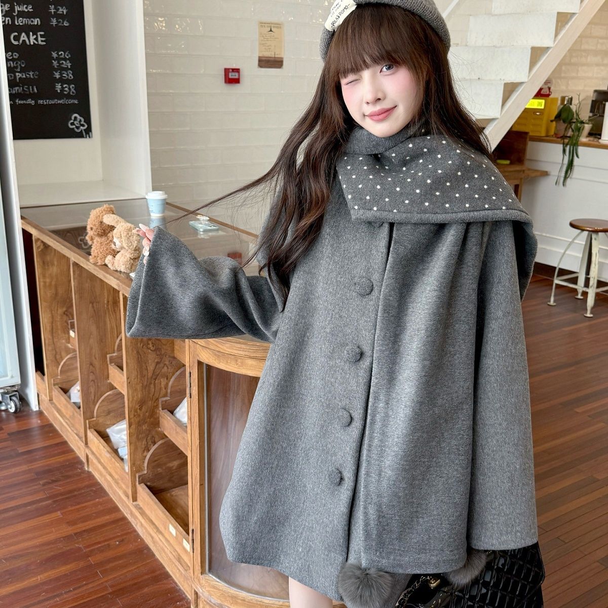 甜美风灰色斗篷披肩毛呢外套女气质百搭加厚宽松韩系自带围脖大衣