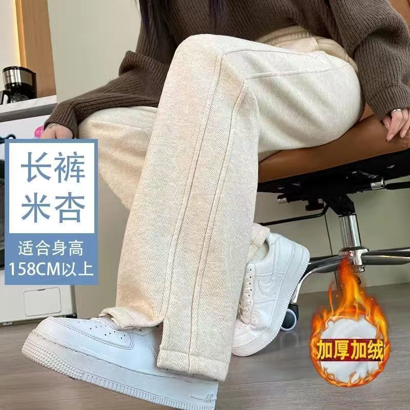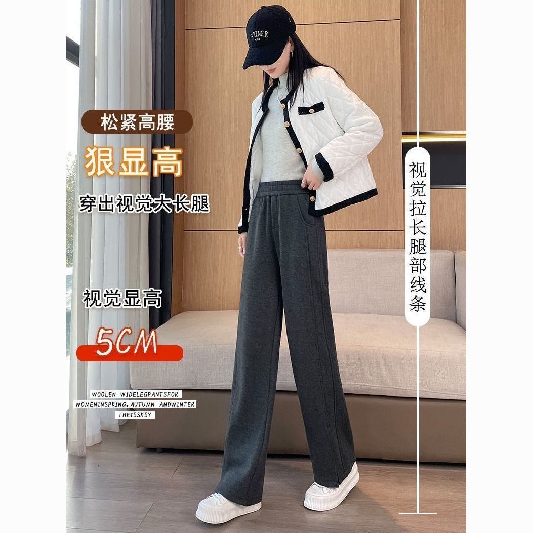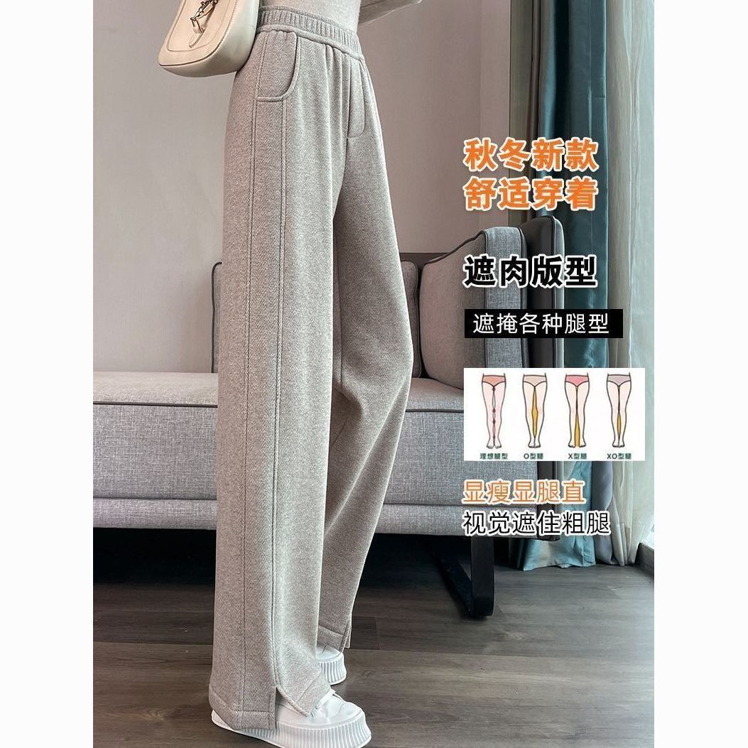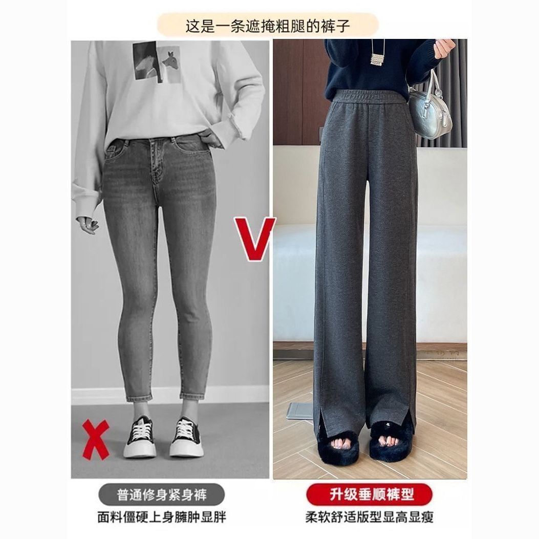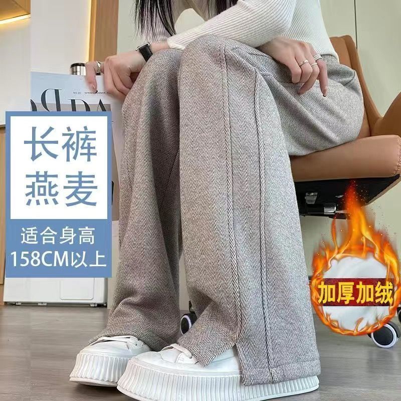 小个子人字纹窄版阔腿裤2025秋冬加绒加厚高腰开叉休闲直筒长裤