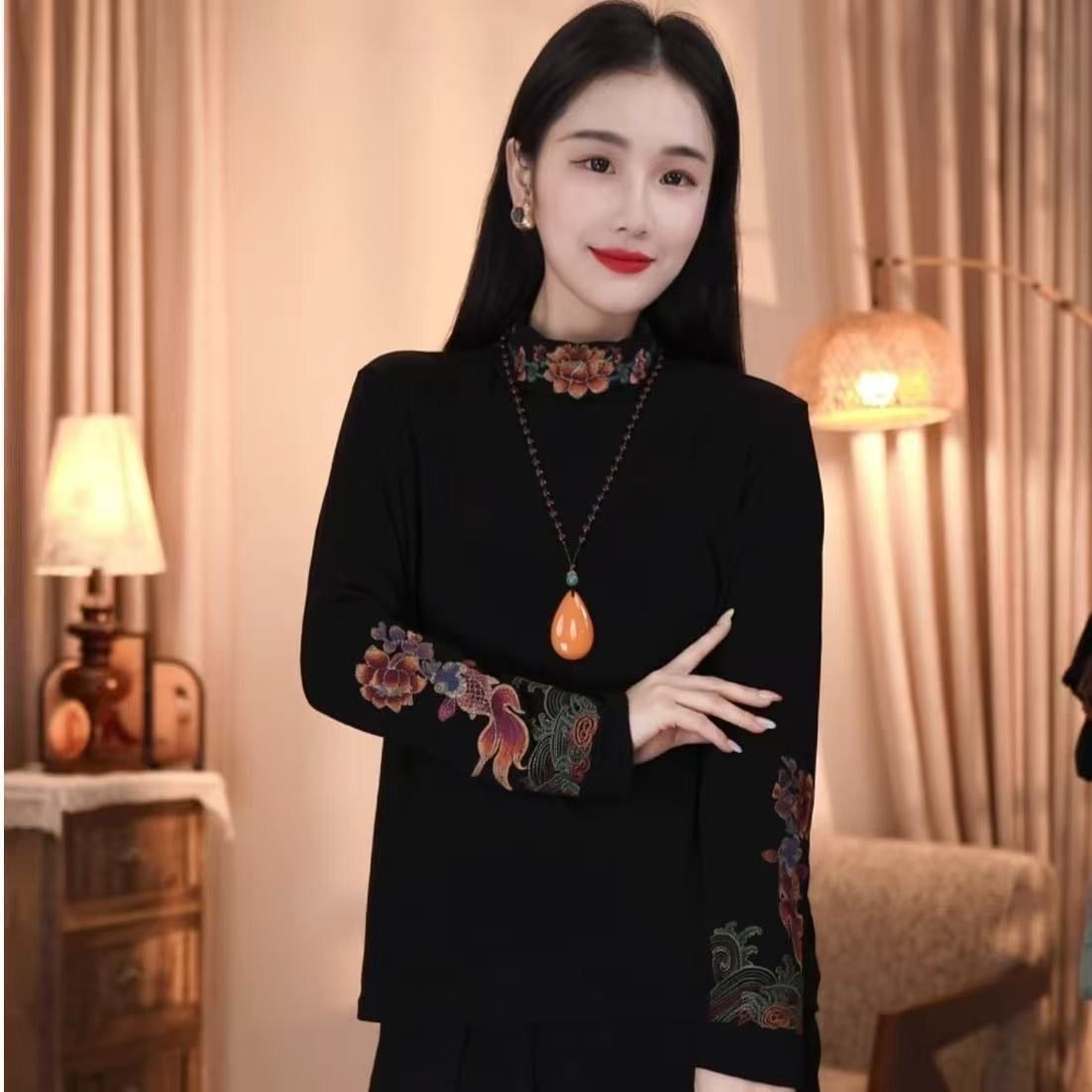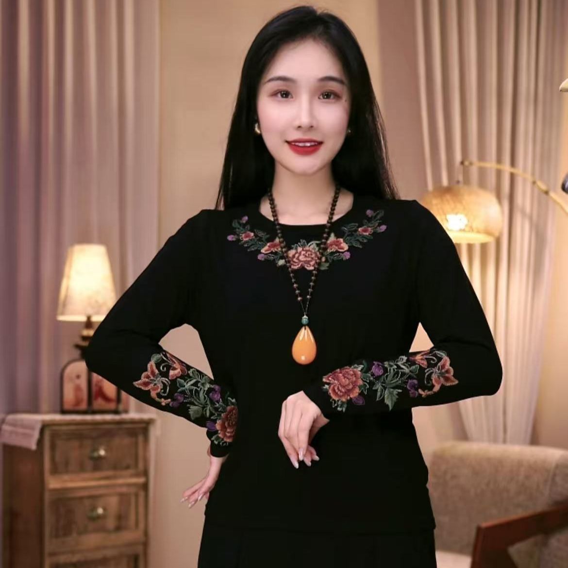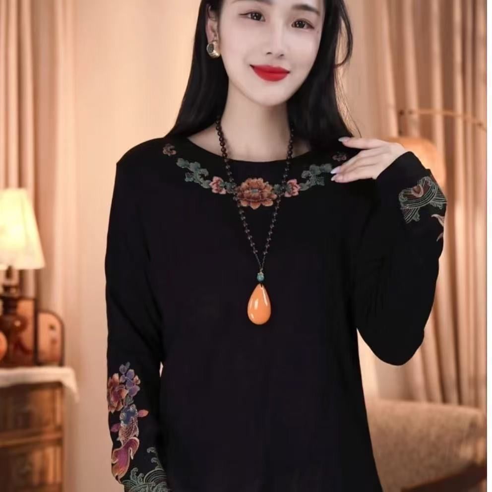 圆领新中式妈妈2026新款长袖打底绣花百搭国风刺绣复古上衣T恤