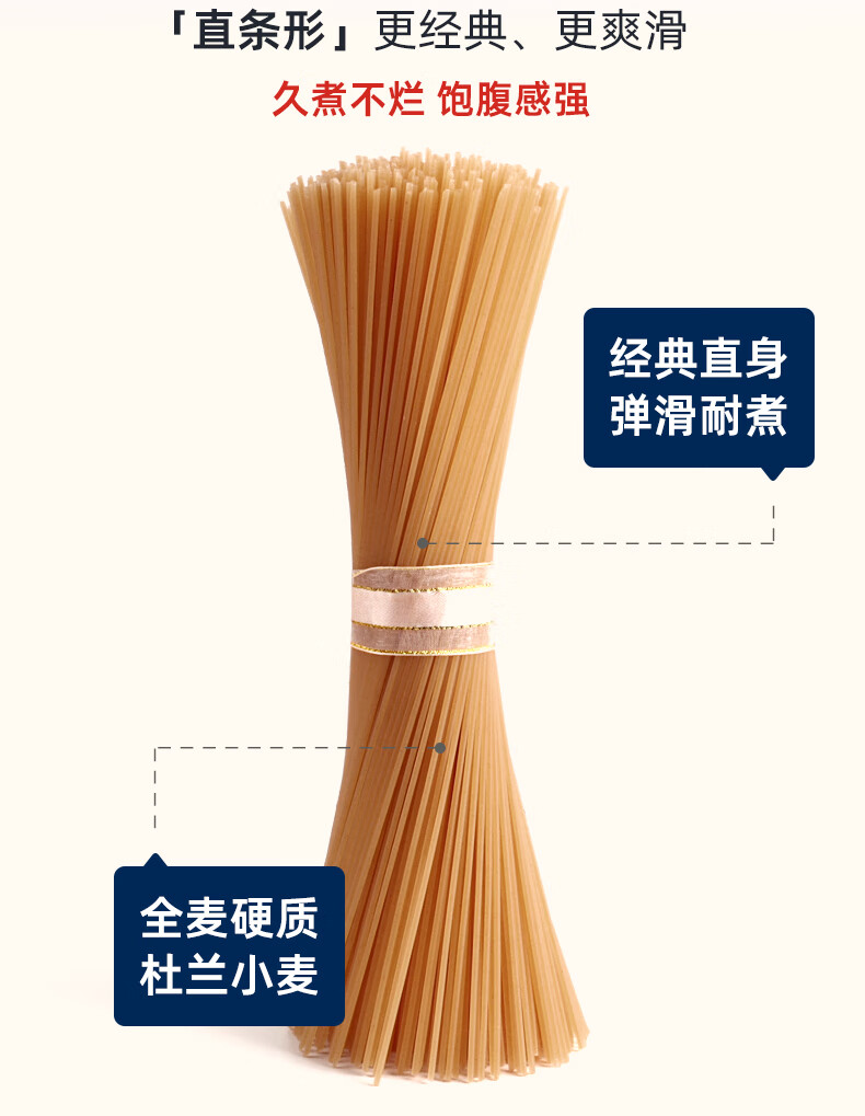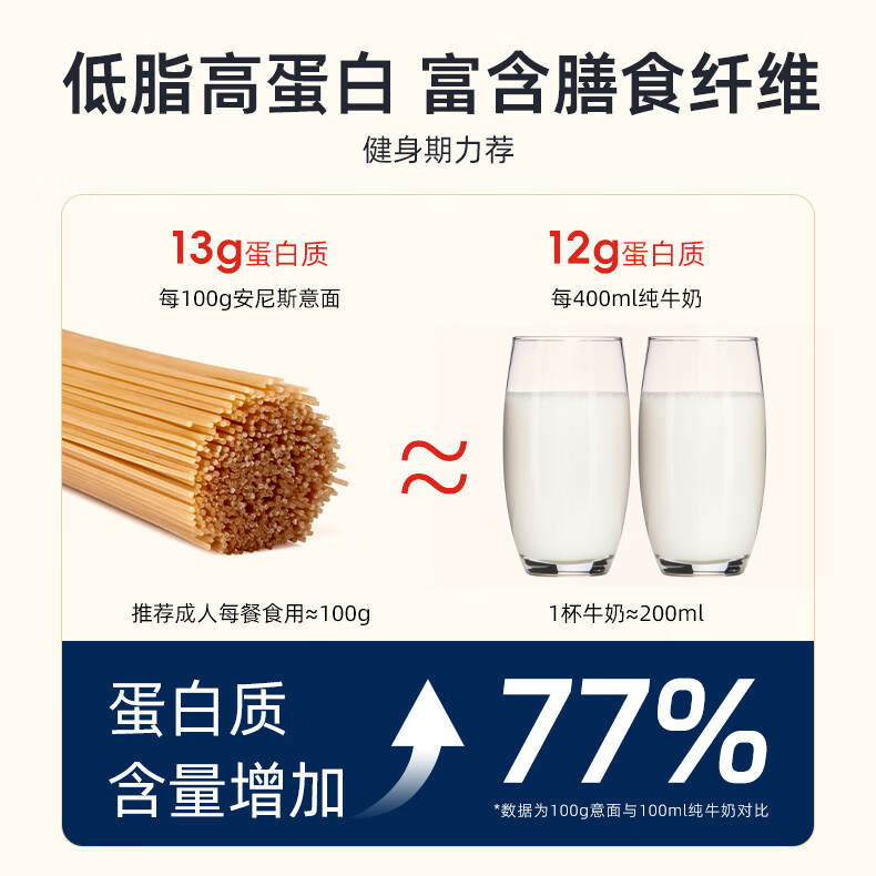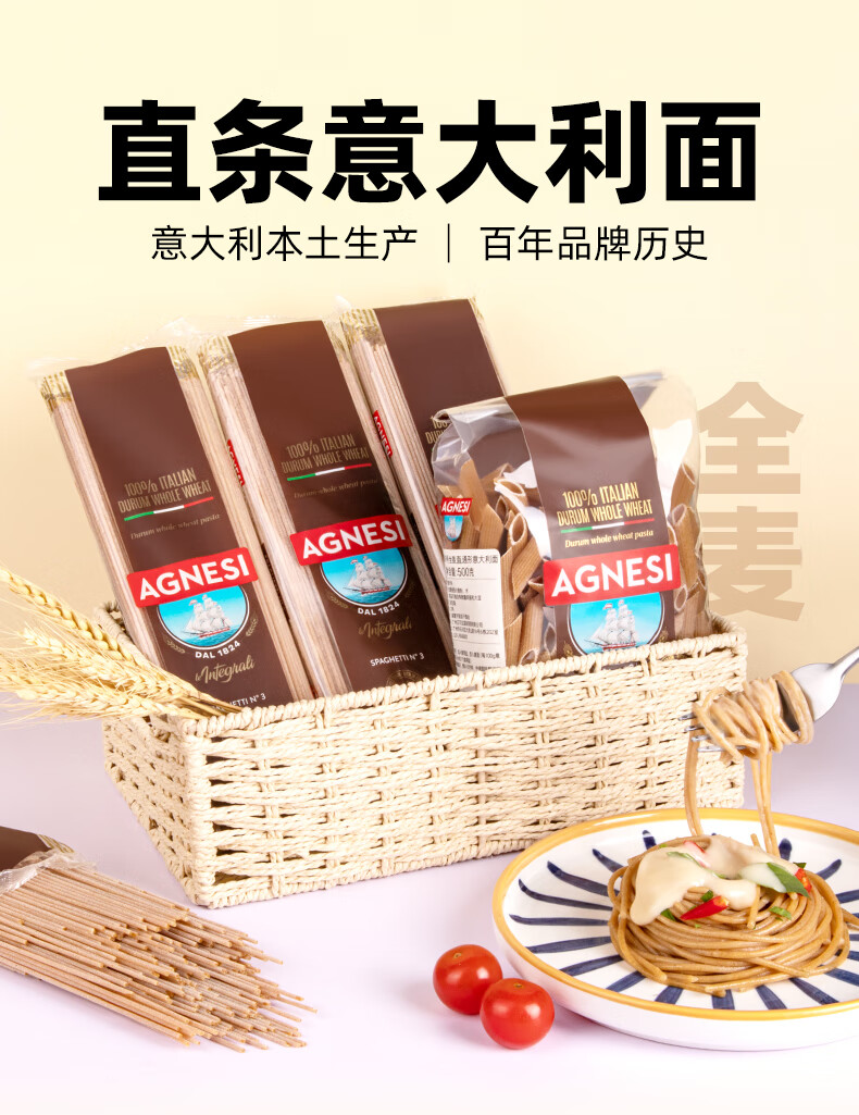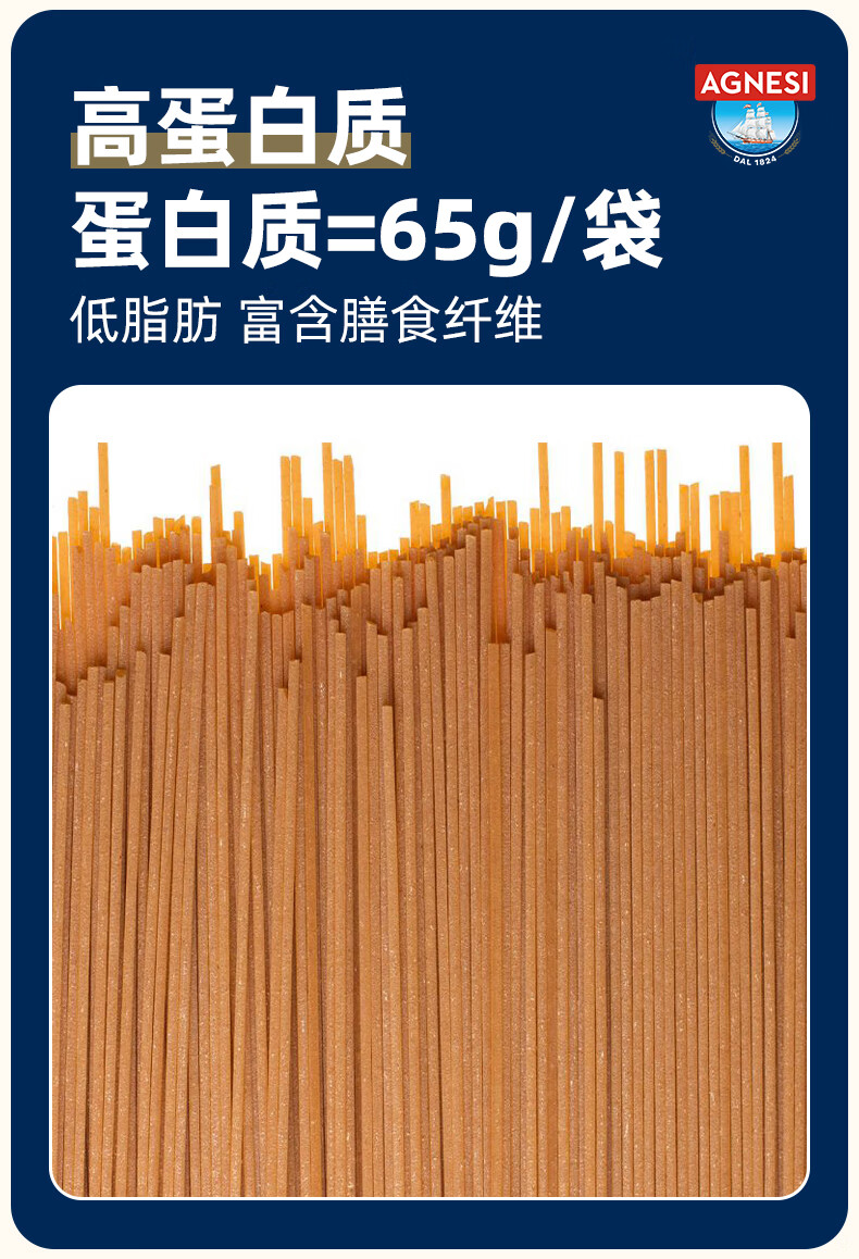 安尼斯全麦直条形意面500g意大利进口传统意面低脂高蛋白健身细意面意粉