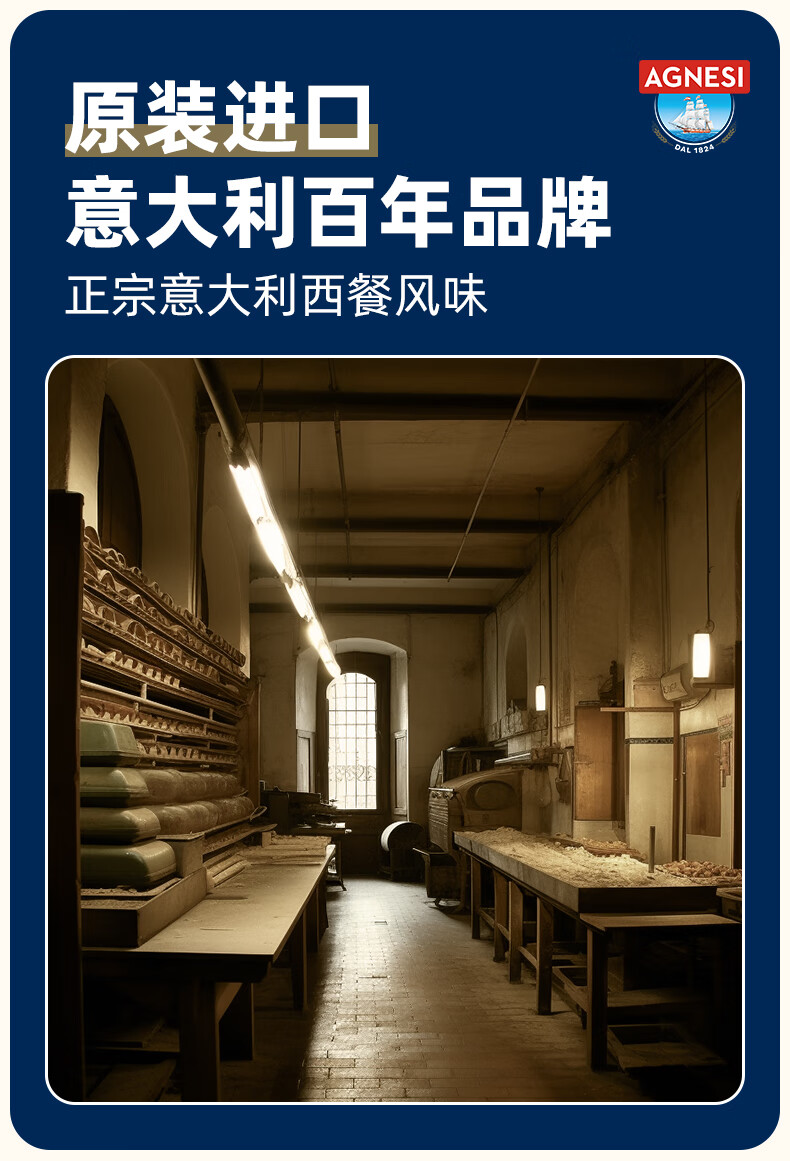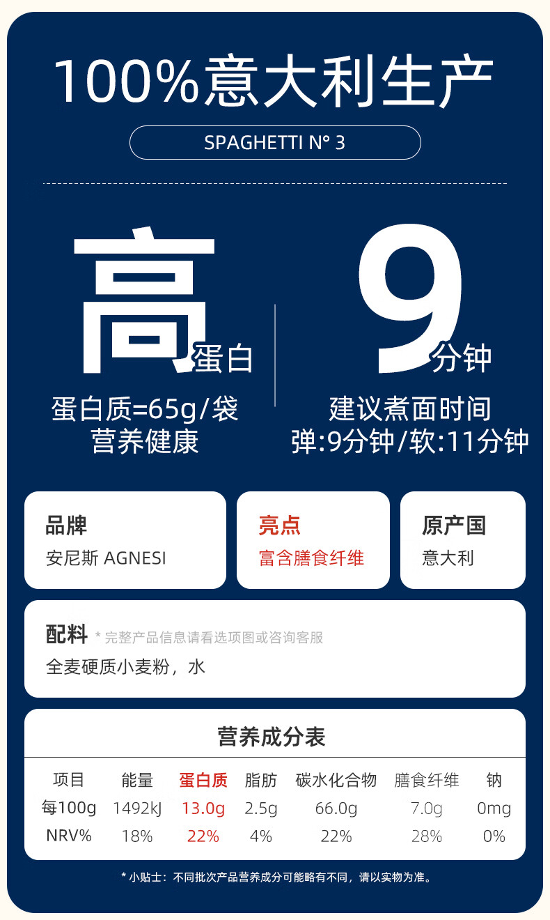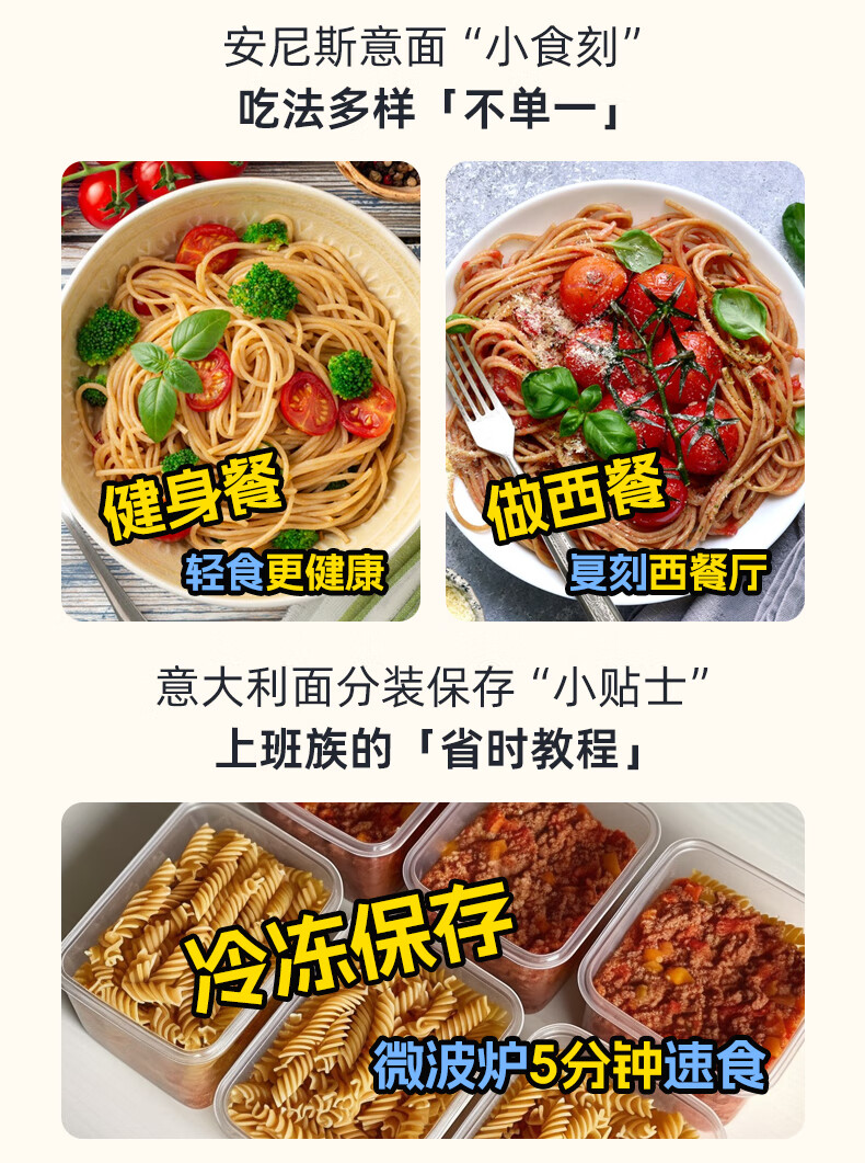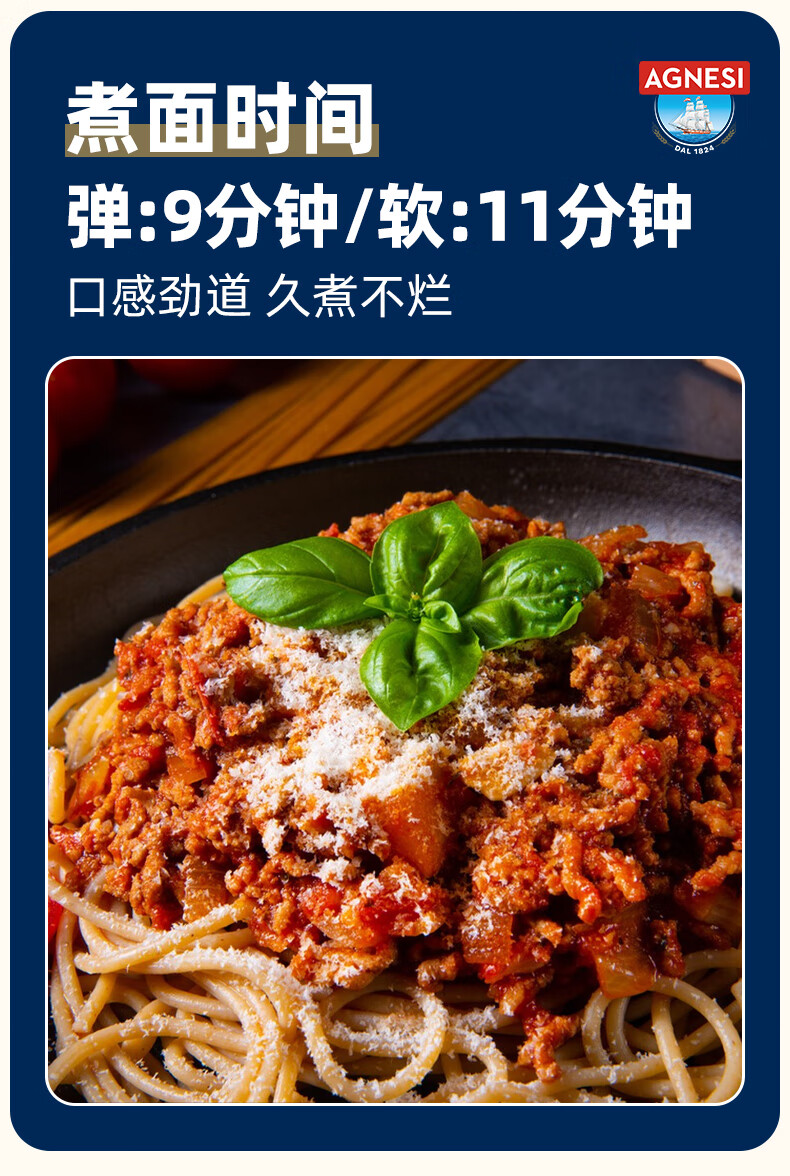 安尼斯全麦直条形意面500g意大利进口传统意面低脂高蛋白健身细意面意粉
