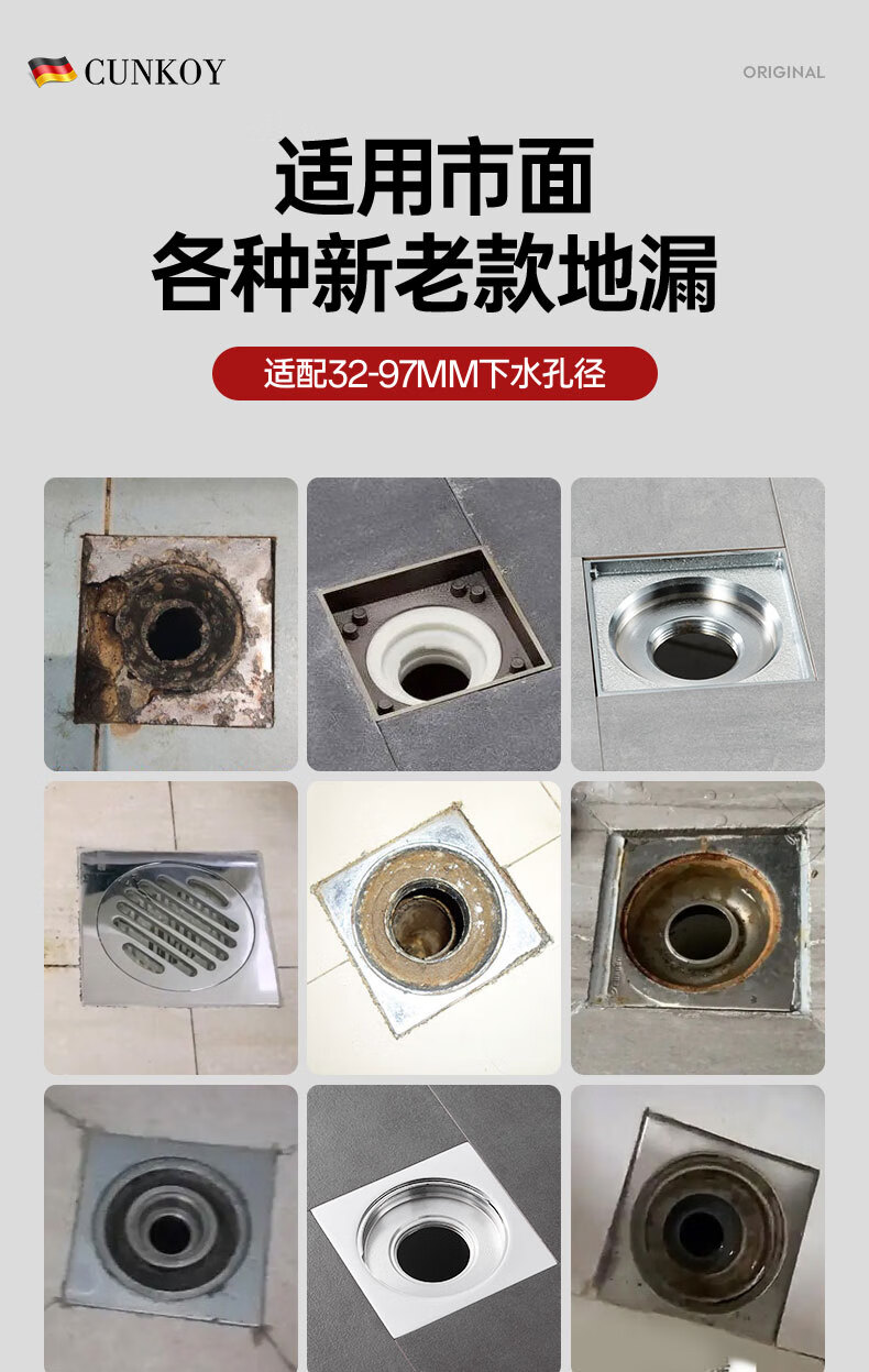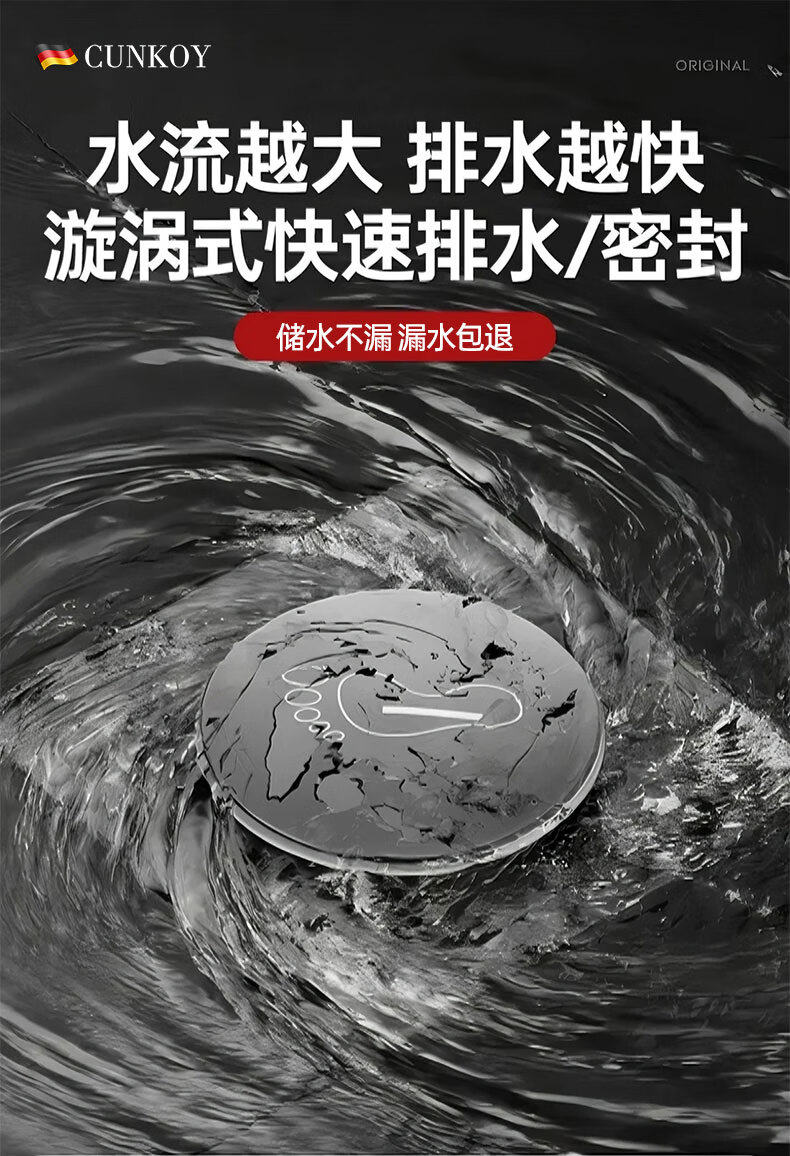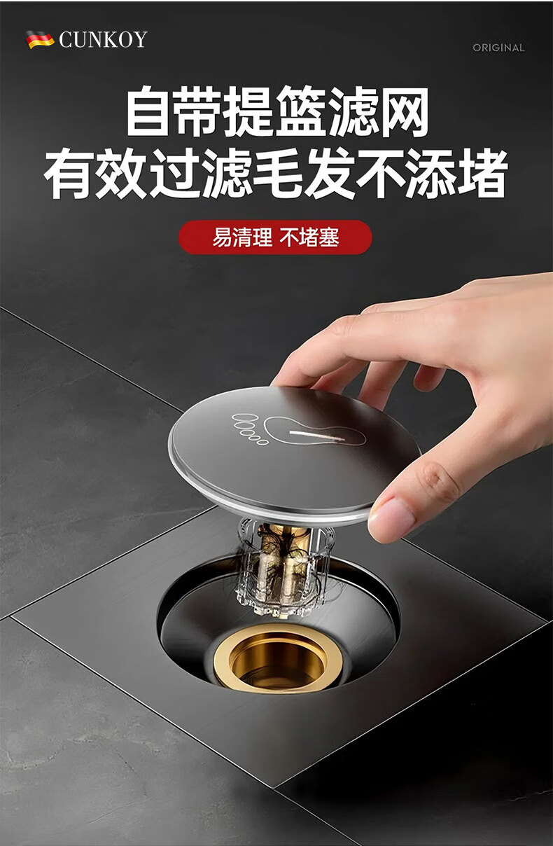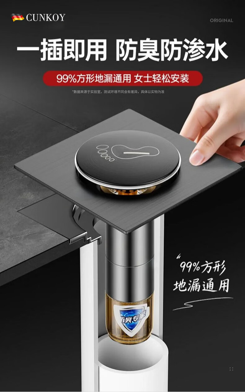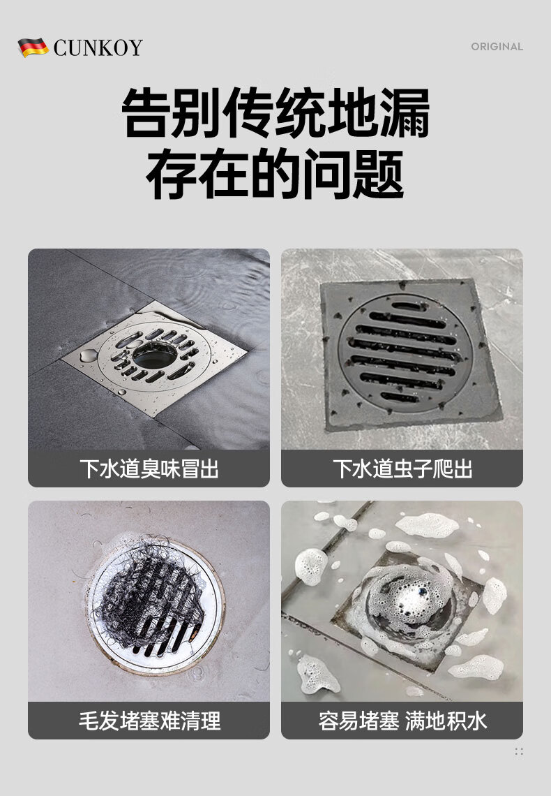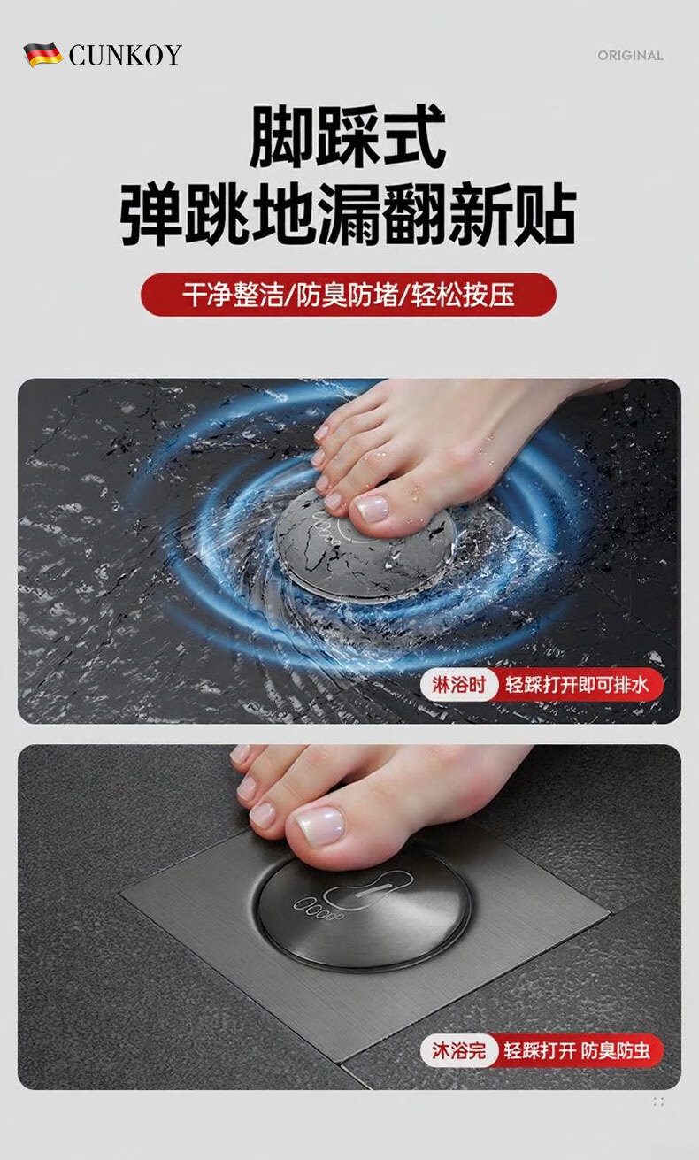 CUNKOY【德国】断层地漏防臭芯卫生间下水道防臭防反味神器脚踩弹跳地漏 弹跳式地漏翻新盖【断层专用】 加厚304面板丨极速排水丨防臭防虫