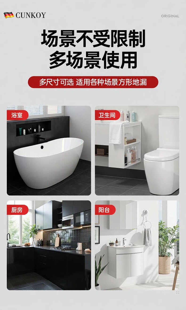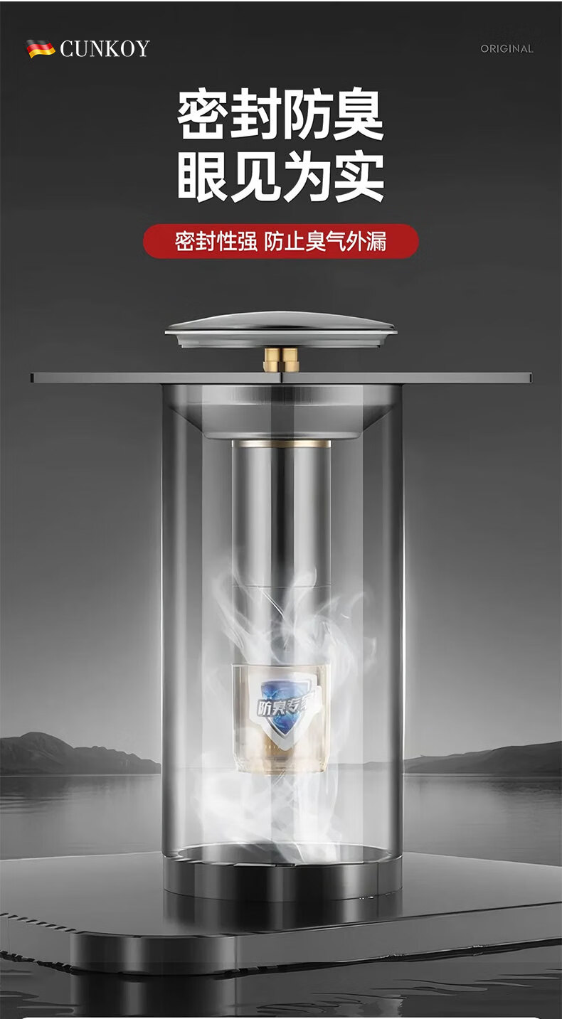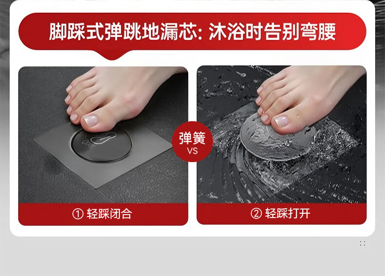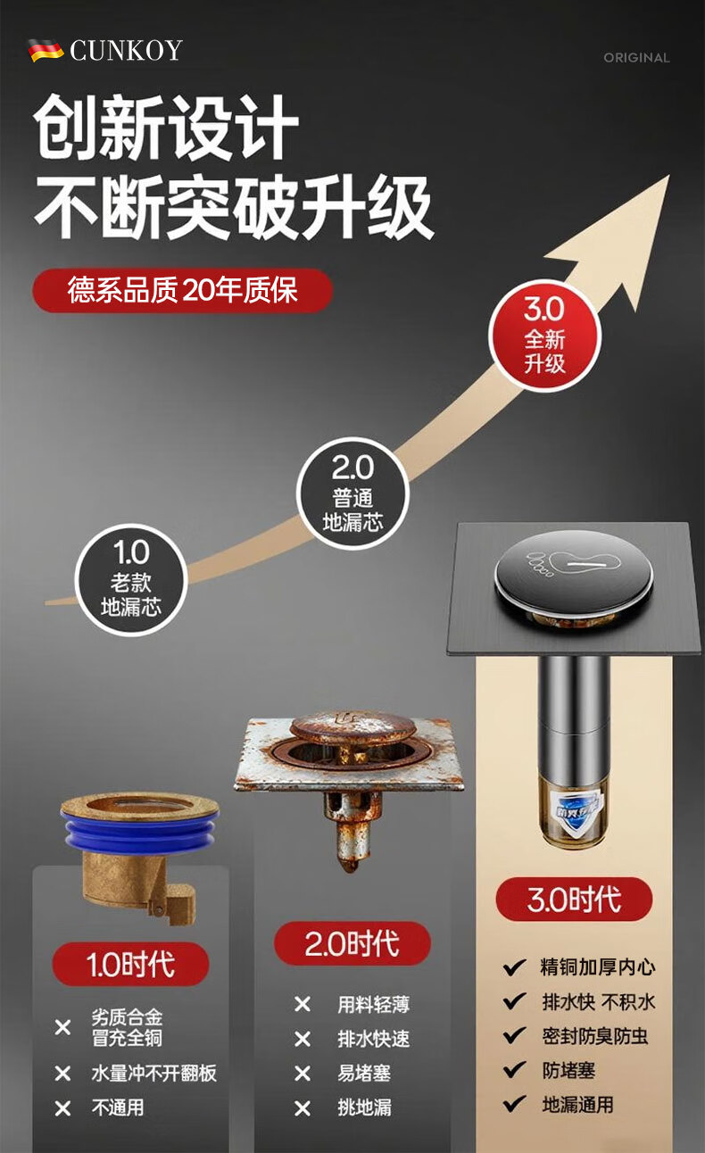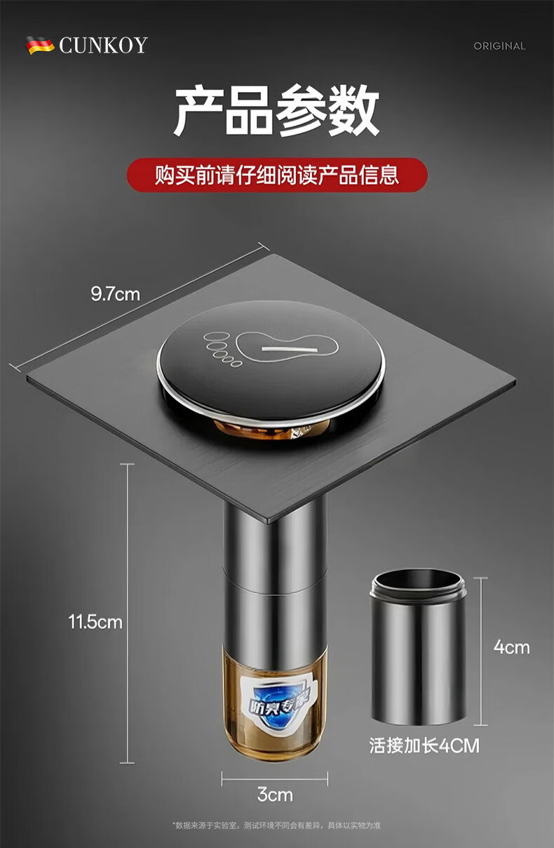 CUNKOY【德国】断层地漏防臭芯卫生间下水道防臭防反味神器脚踩弹跳地漏 弹跳式地漏翻新盖【断层专用】 加厚304面板丨极速排水丨防臭防虫