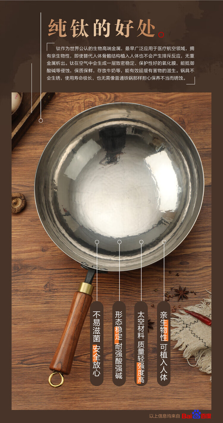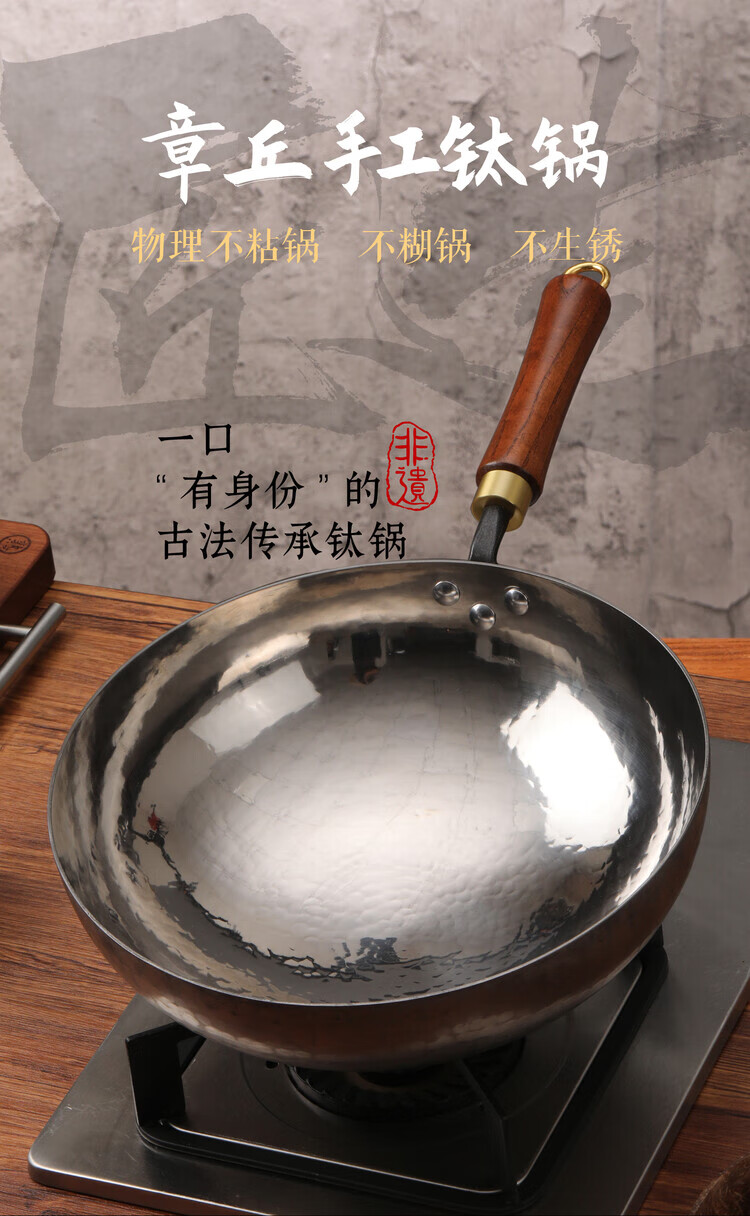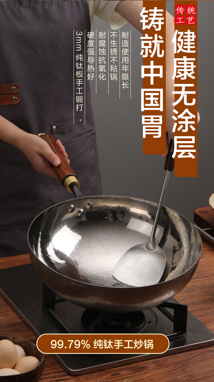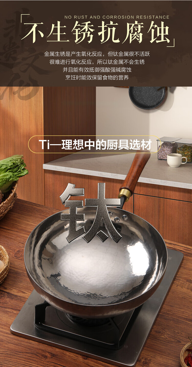 泰禧阁章丘纯手工钛锅无涂层不粘锅电磁炉燃气纯钛炒锅多功能家用炒菜锅 34cm老师傅锻打红木把钛锅 34cm