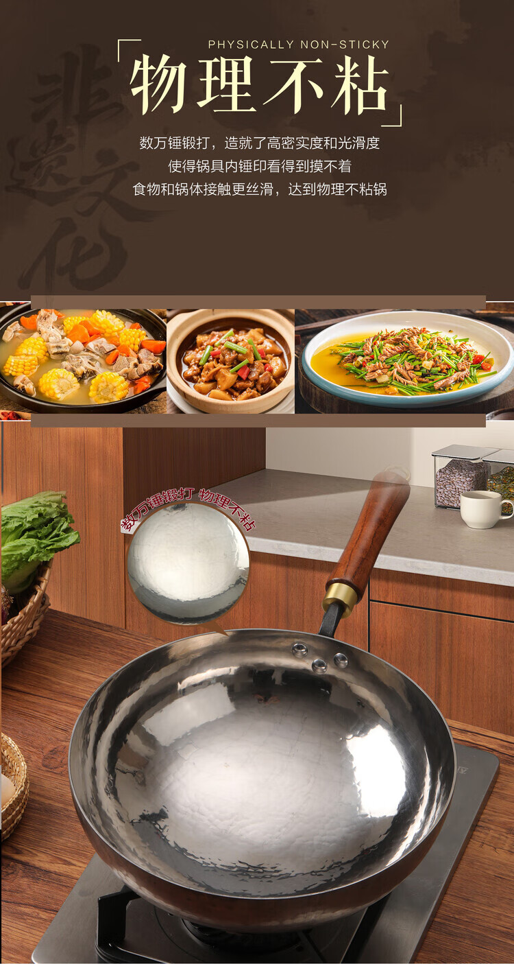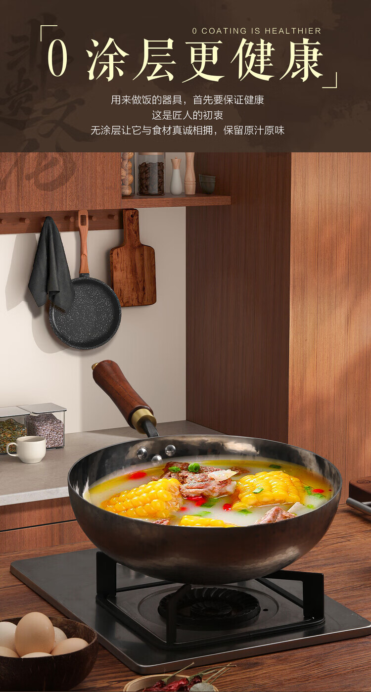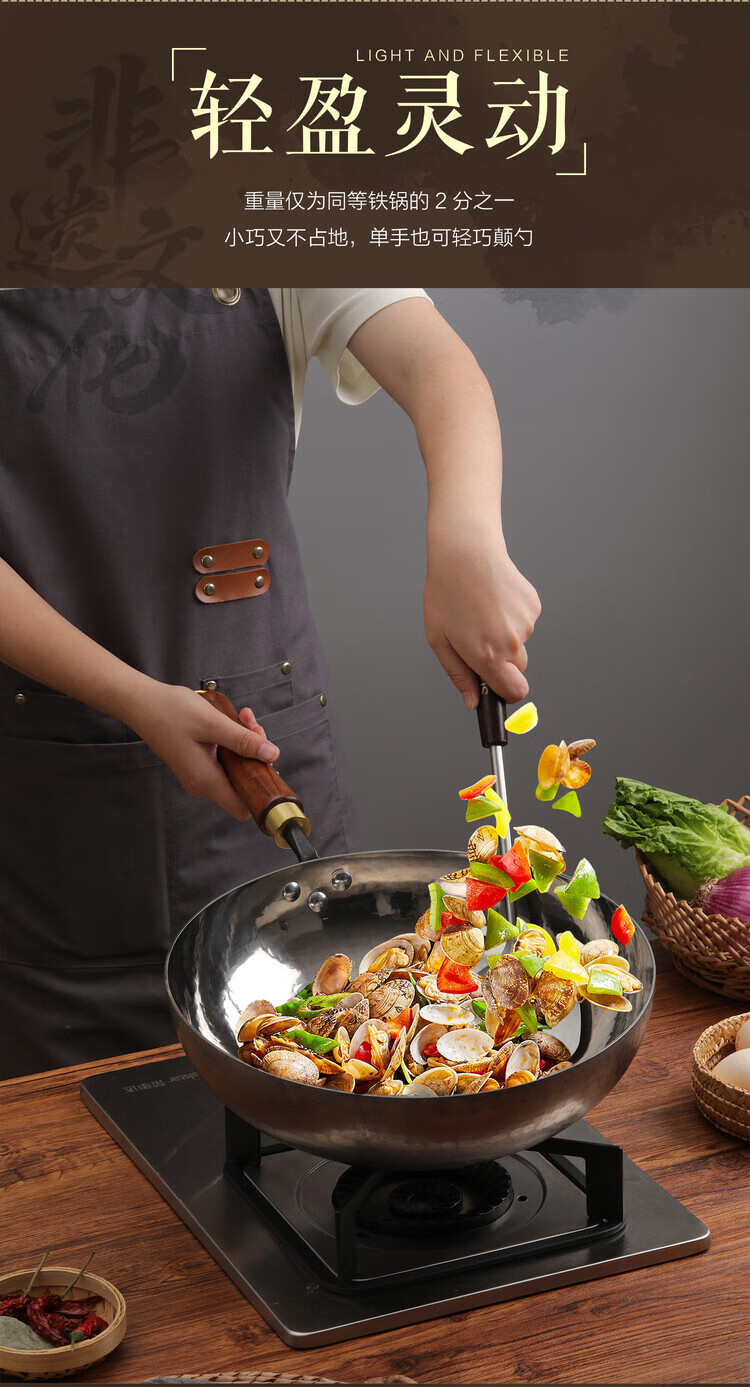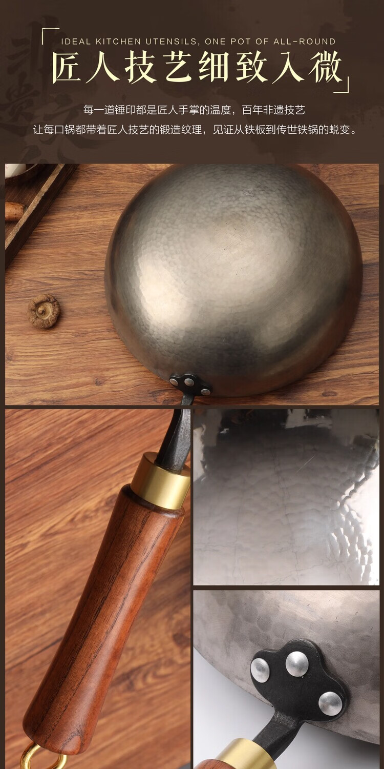 泰禧阁章丘纯手工钛锅无涂层不粘锅电磁炉燃气纯钛炒锅多功能家用炒菜锅 34cm老师傅锻打红木把钛锅 34cm
