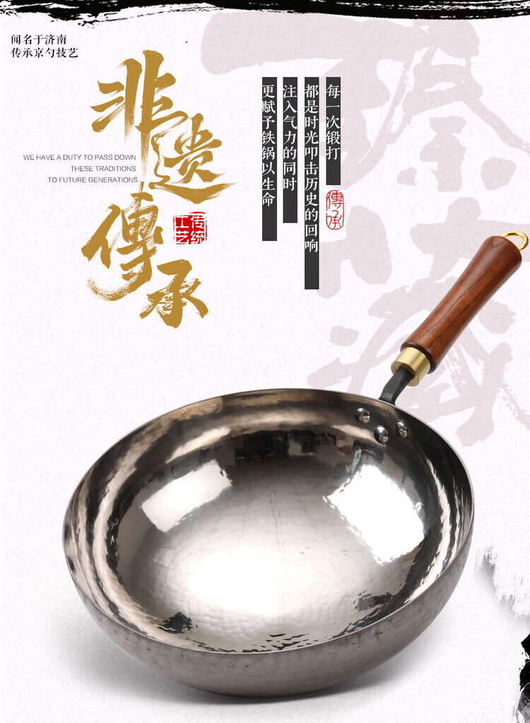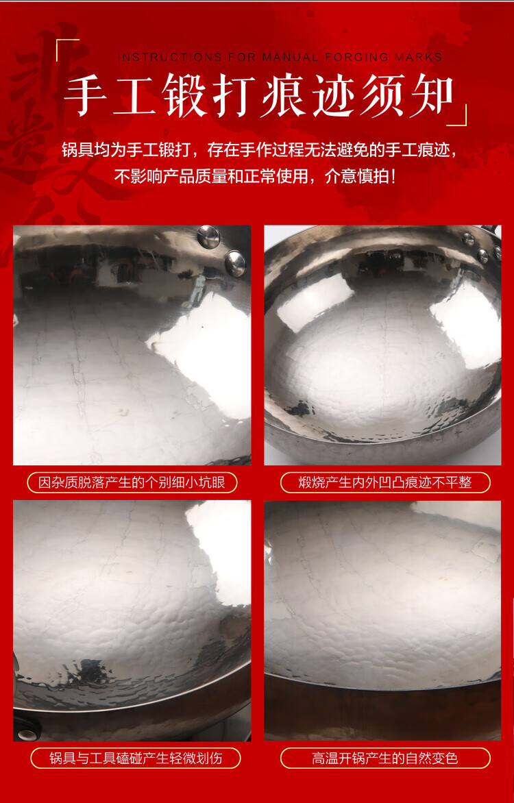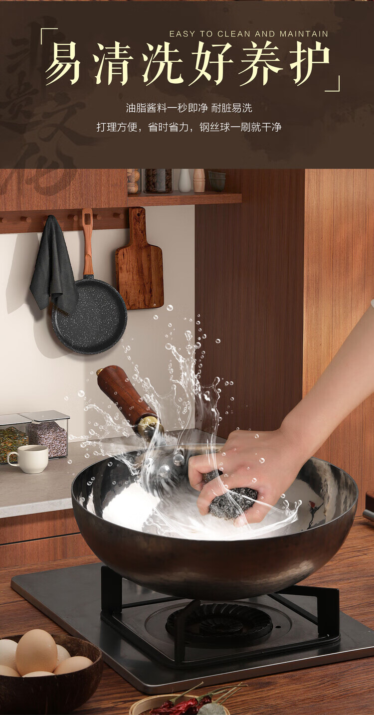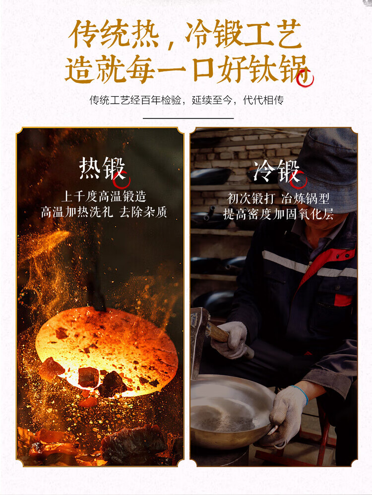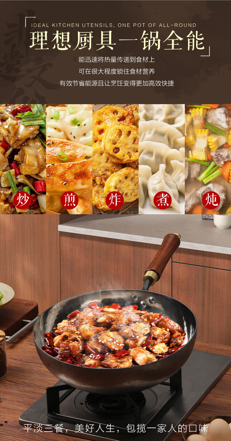 泰禧阁章丘纯手工钛锅无涂层不粘锅电磁炉燃气纯钛炒锅多功能家用炒菜锅 34cm老师傅锻打红木把钛锅 34cm