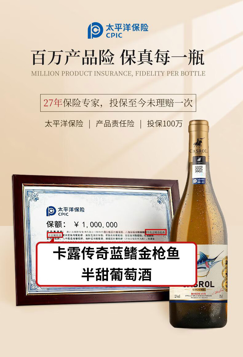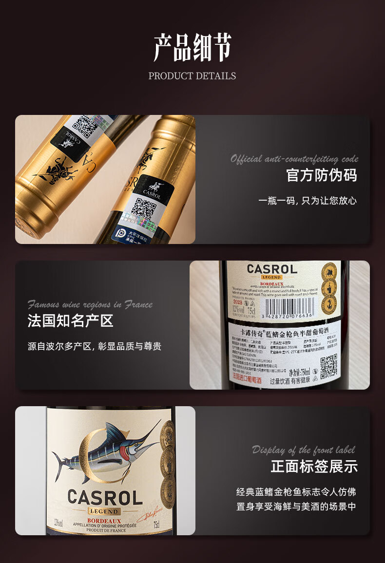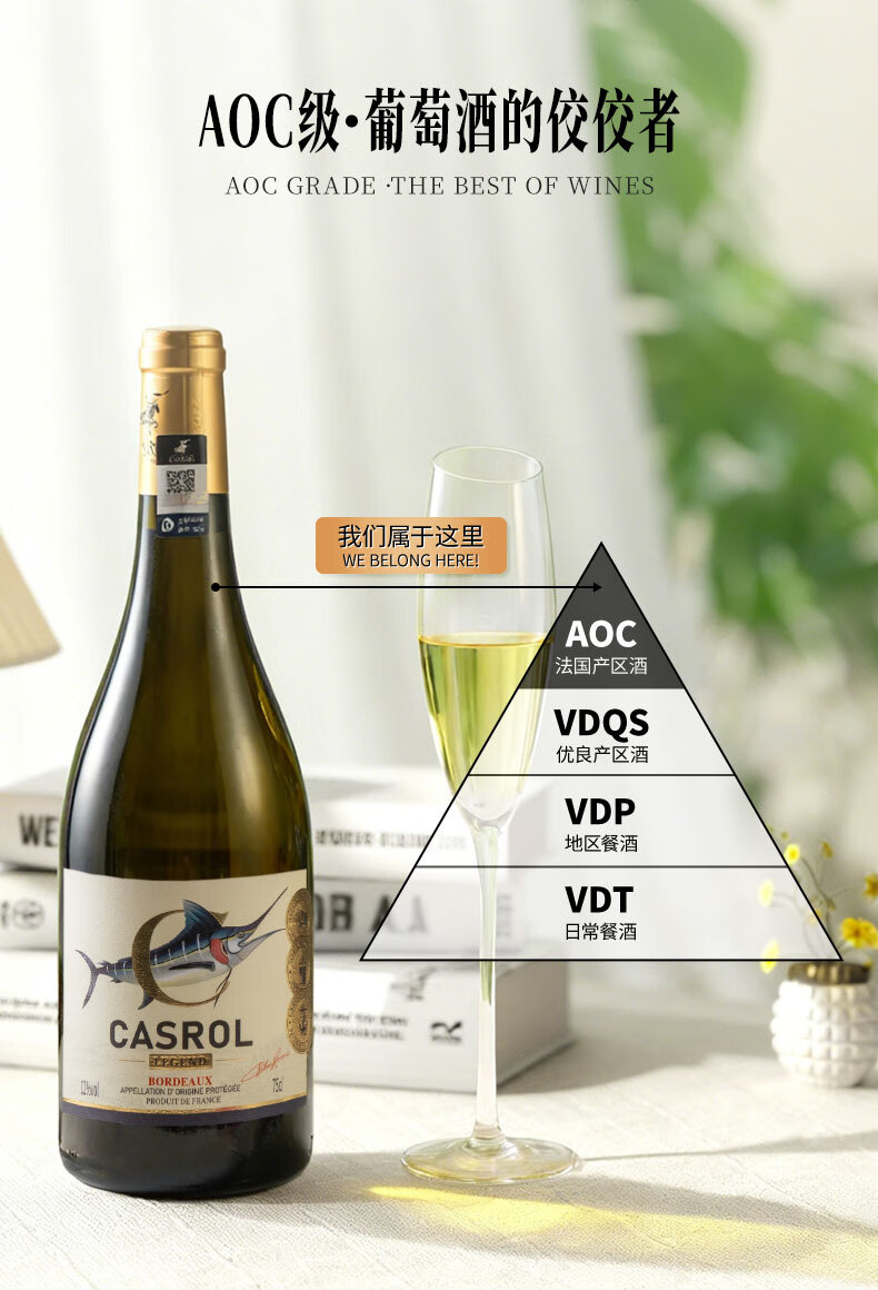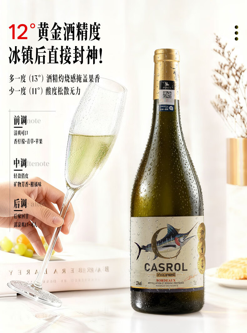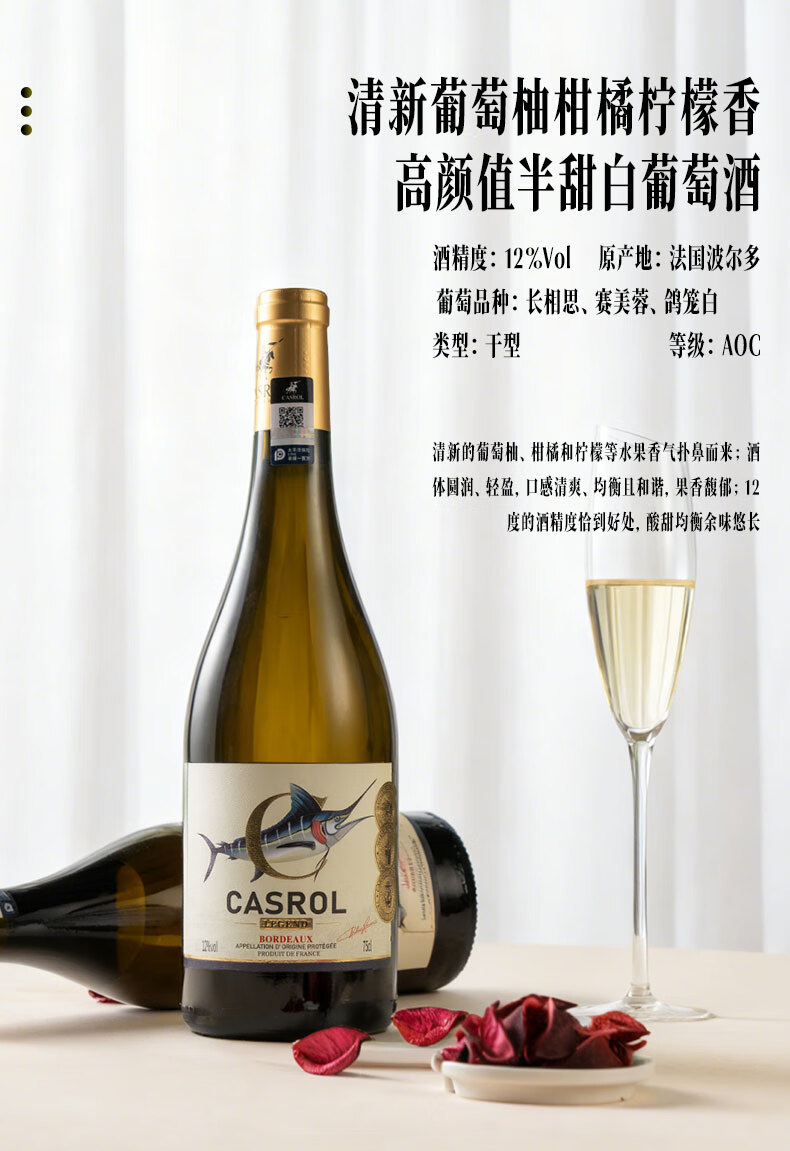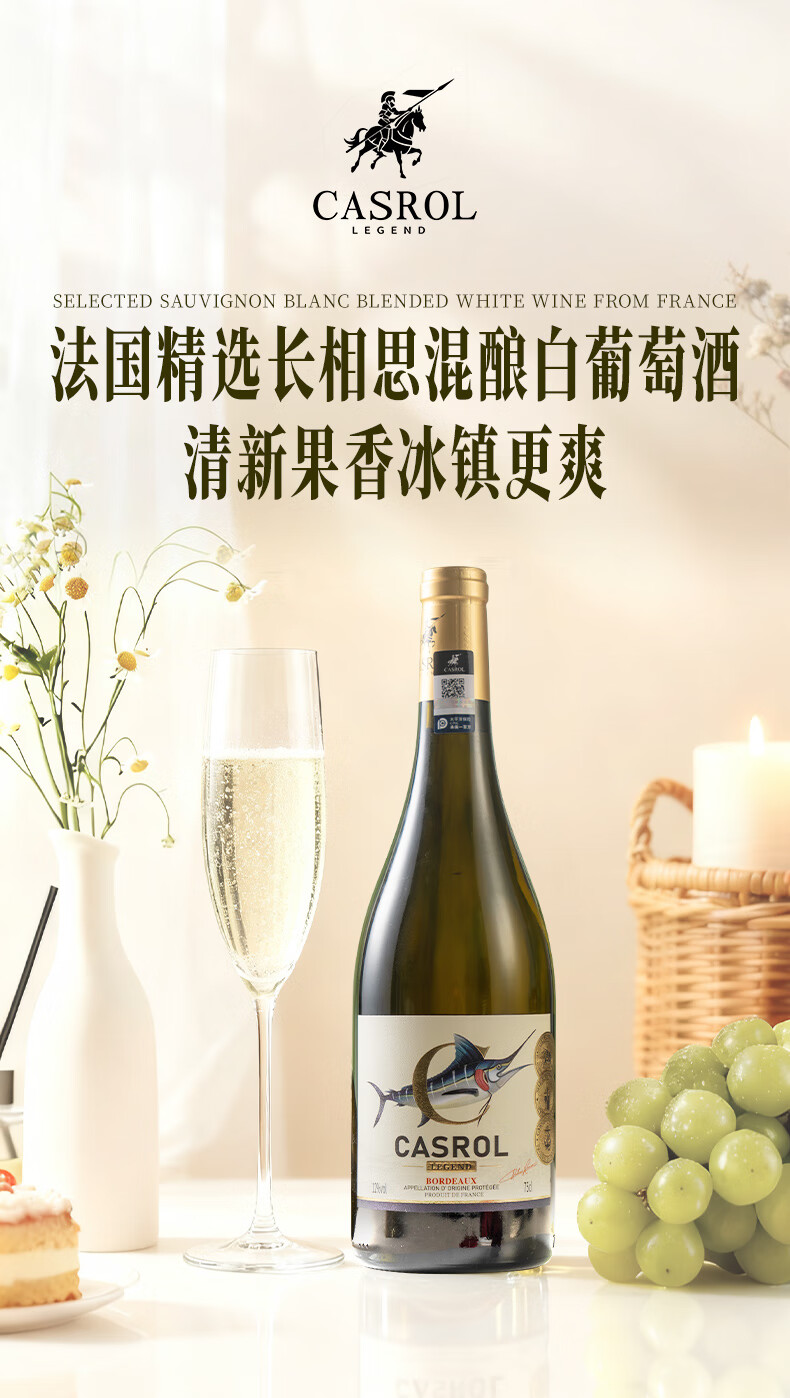 卡露传奇法国波尔多AOC半甜白葡萄酒金枪鱼12度长相思混酿750ml单瓶装送礼