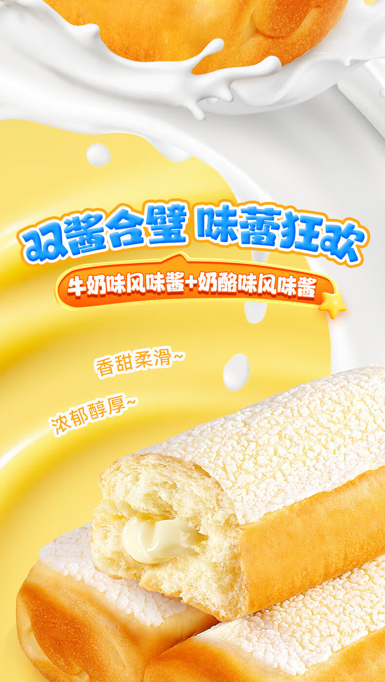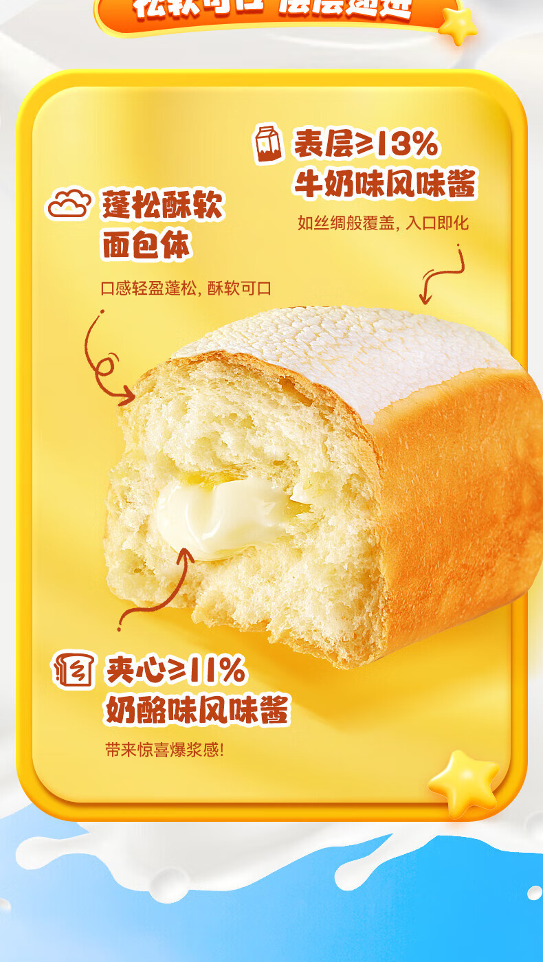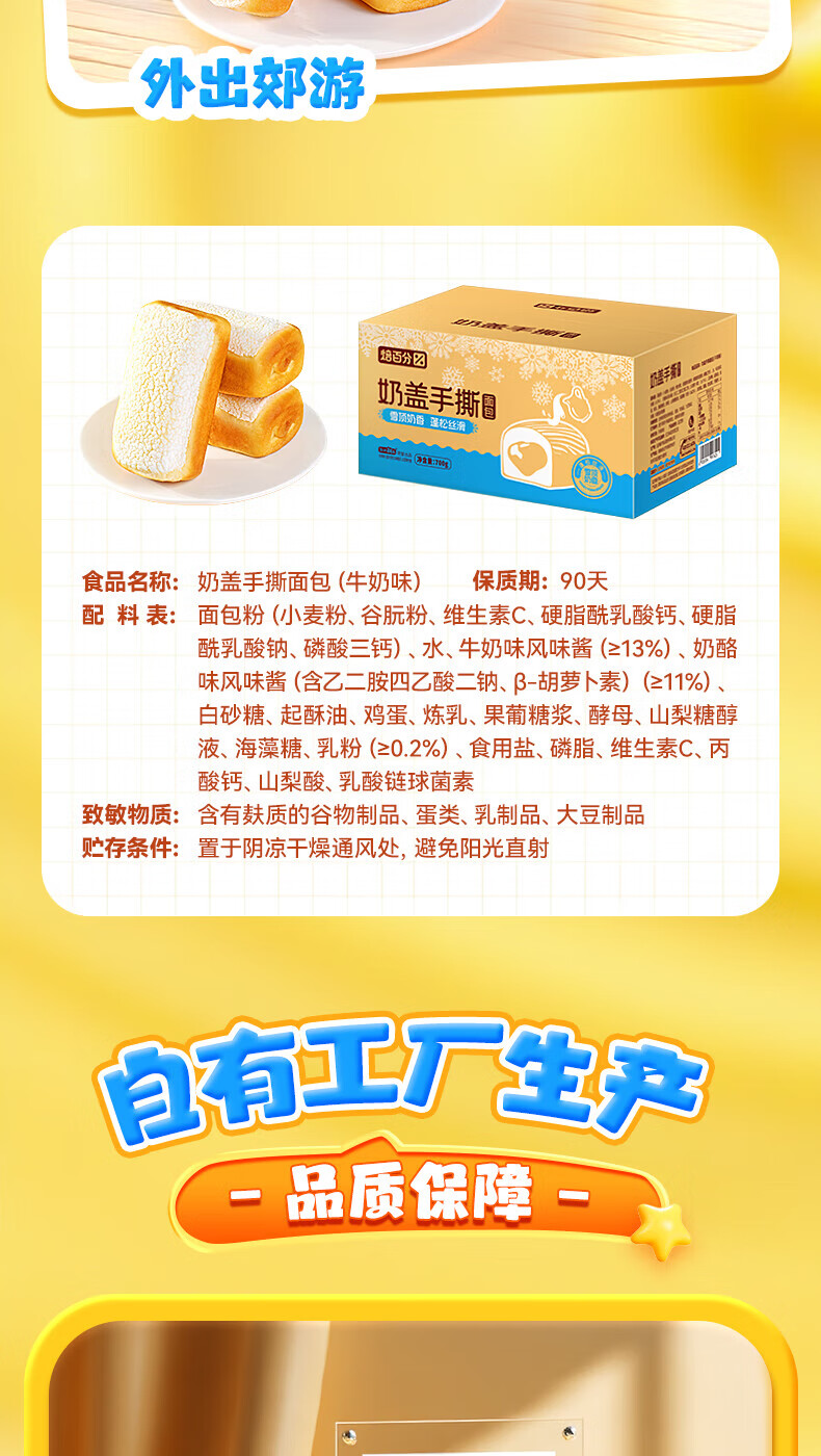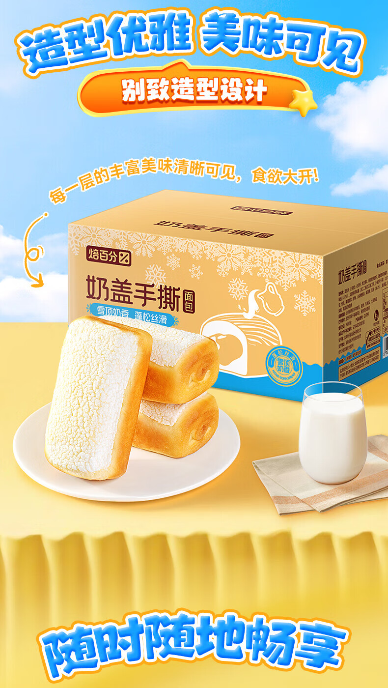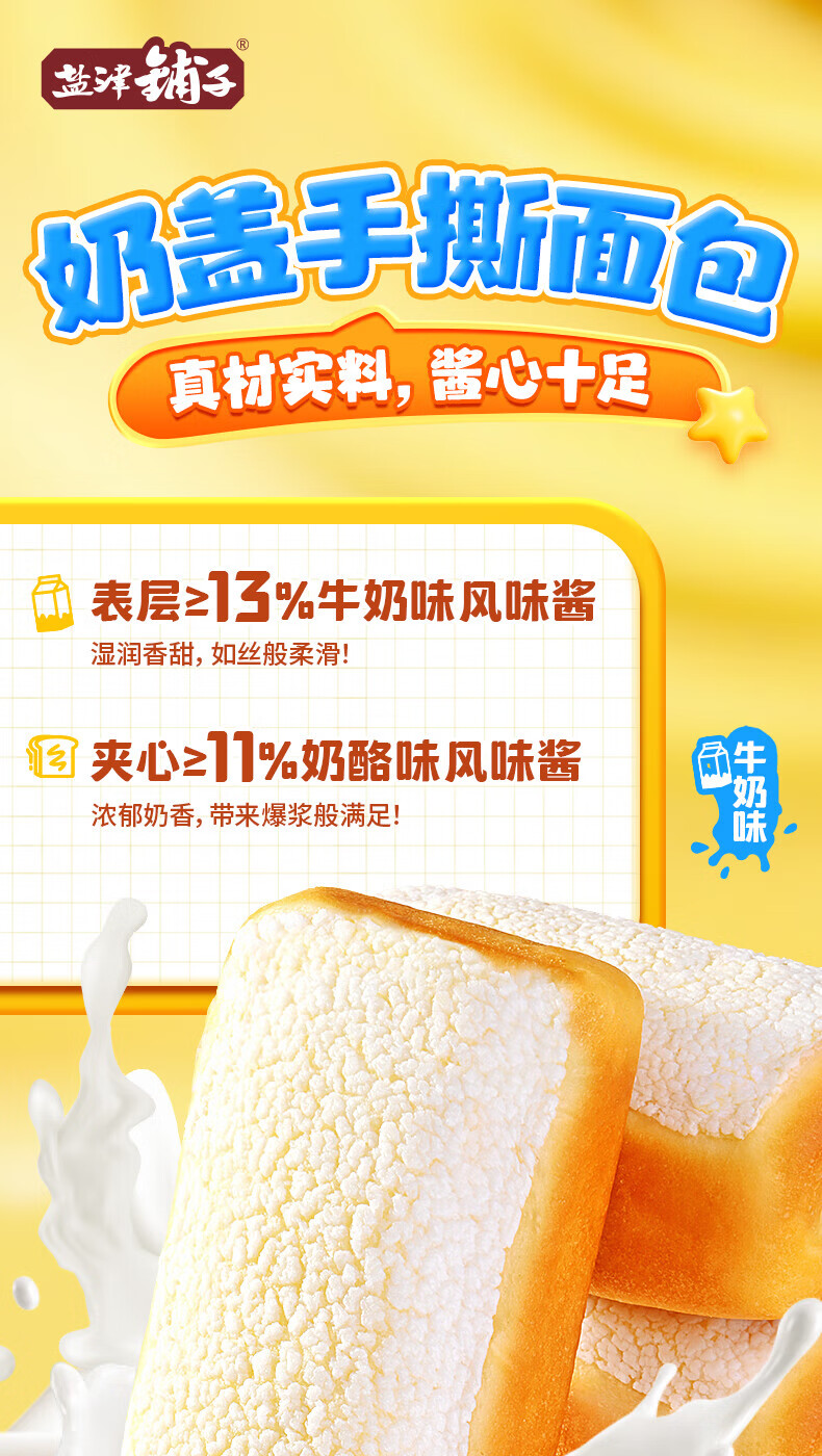 盐津铺子焙百分奶盖夹心手撕面包休闲零食糕点点心早餐代餐 约700g约13个 700g*1箱