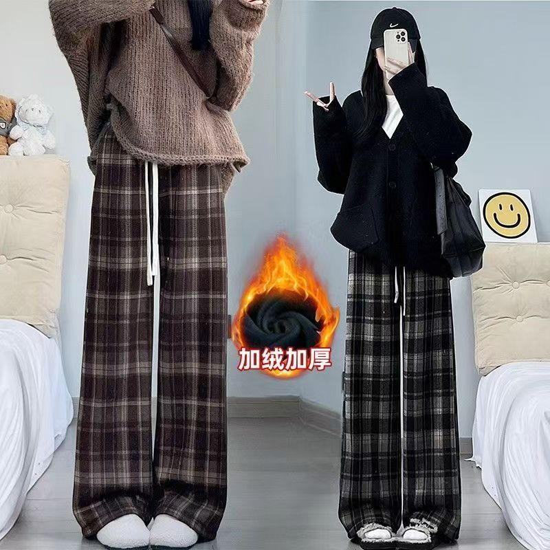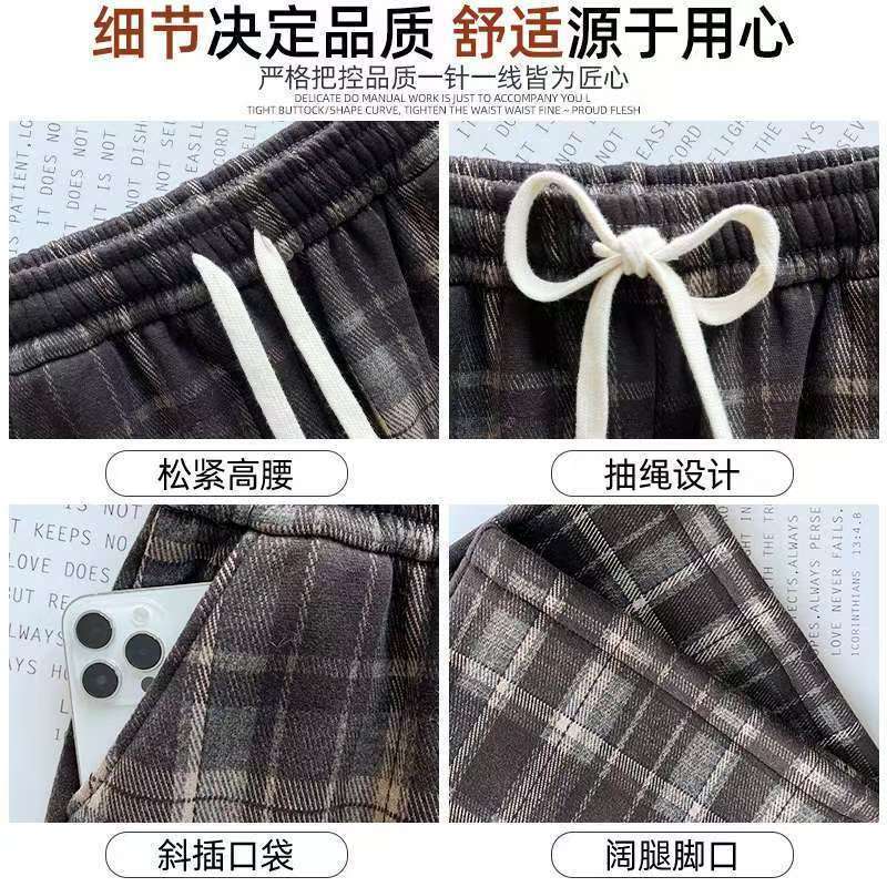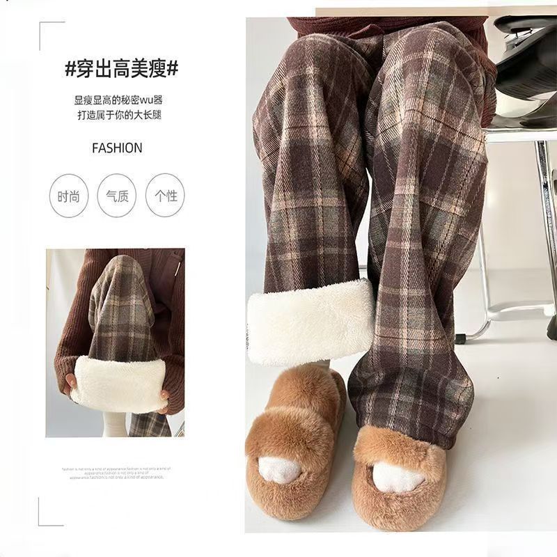 复古格子阔腿阔腿裤裤女羊羔绒秋冬新款加绒2025加厚慵懒棉裤保暖