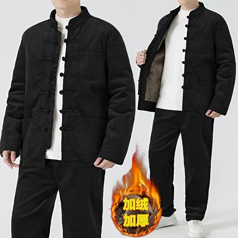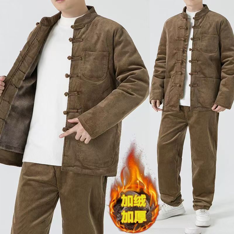 中国风唐装男休闲套装秋冬季民族加绒加厚复古盘扣中式外套两件套