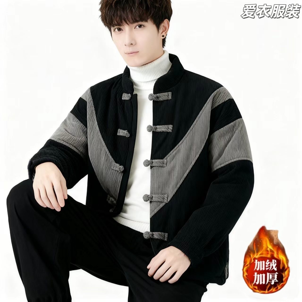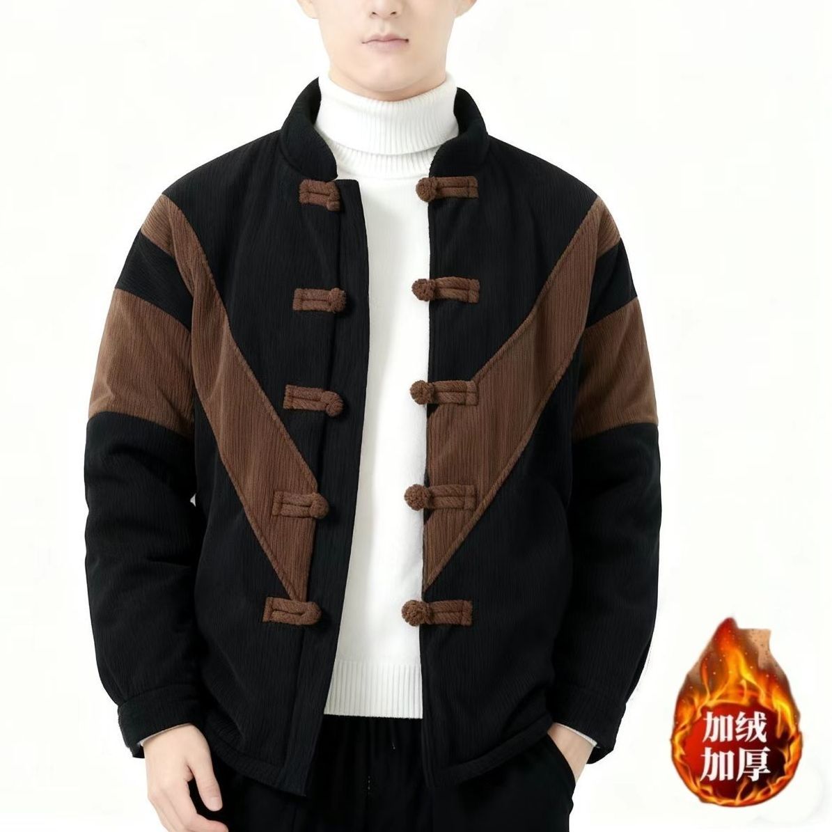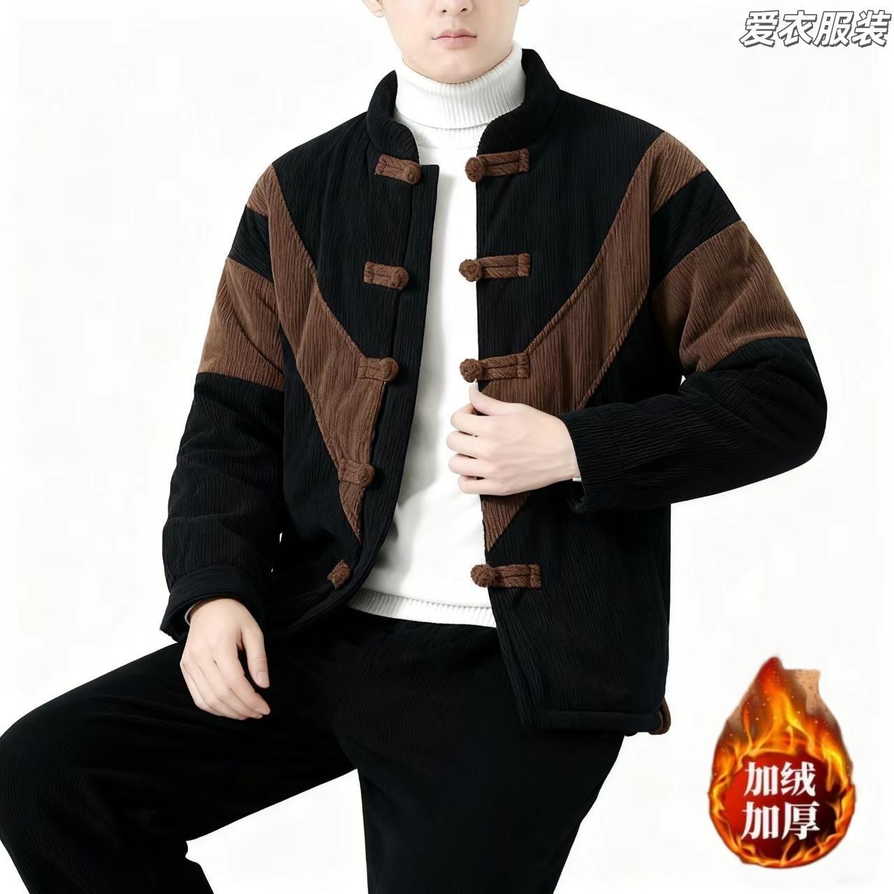 新中式冬季灯芯绒加厚唐装棉衣男撞色拼接传统盘扣棉袄中国风外套