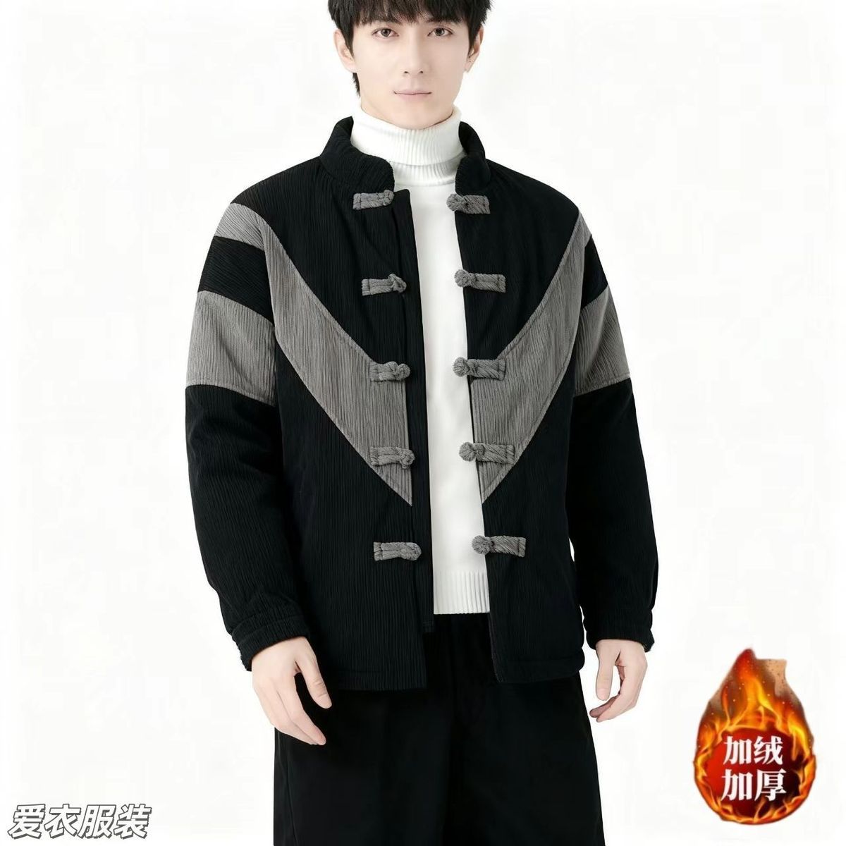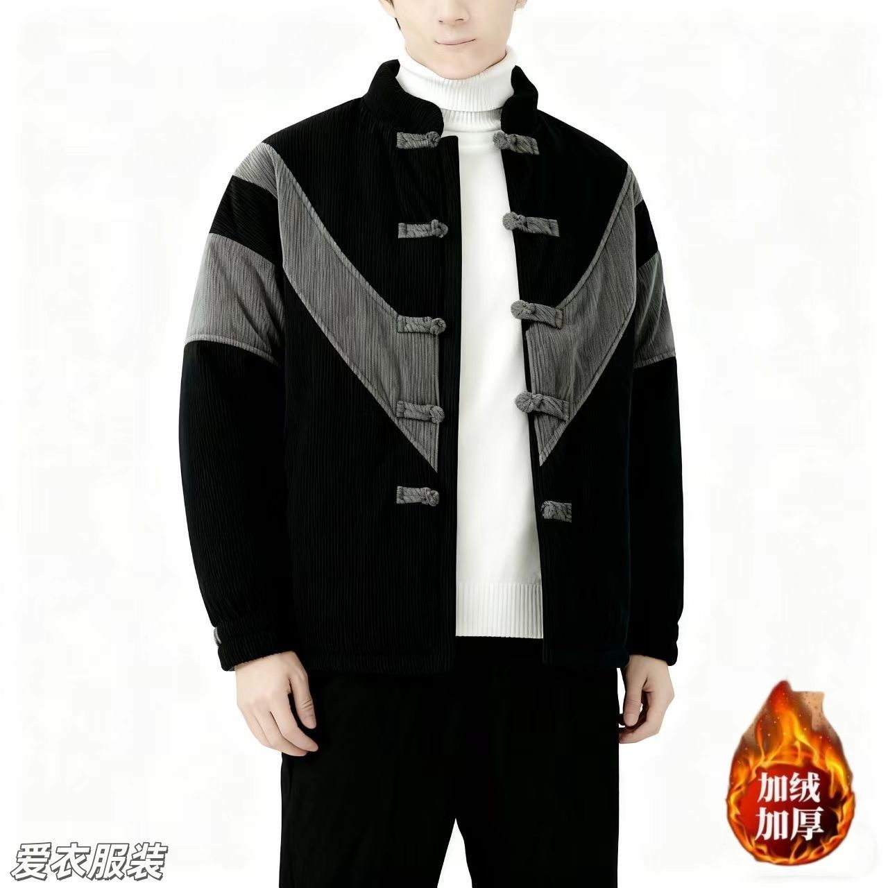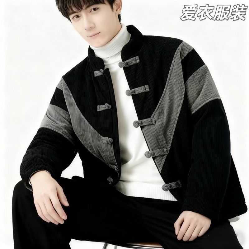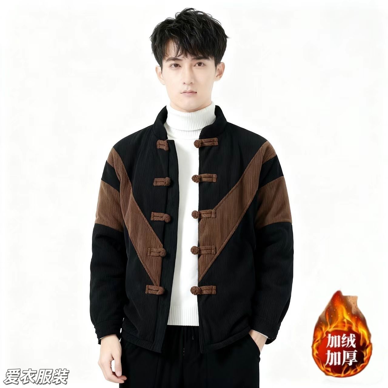新中式冬季灯芯绒加厚唐装棉衣男撞色拼接传统盘扣棉袄中国风外套