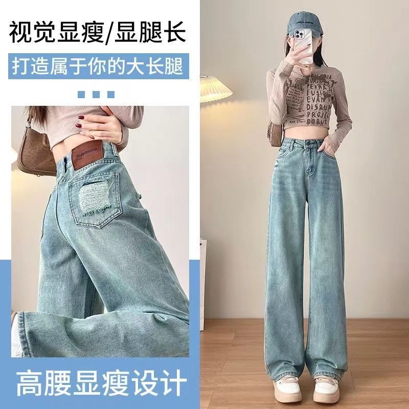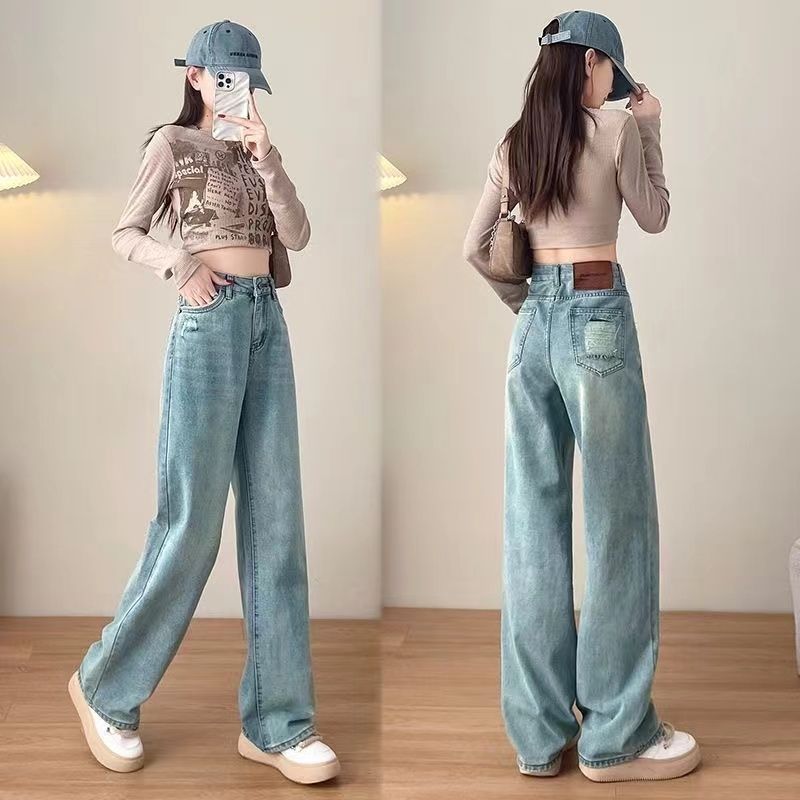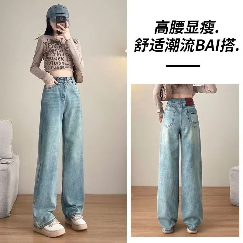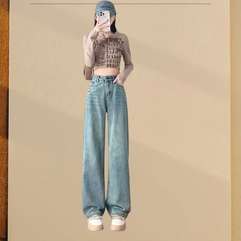 高腰牛仔裤新款美式窄版直筒宽松显瘦垂感拖地裤子